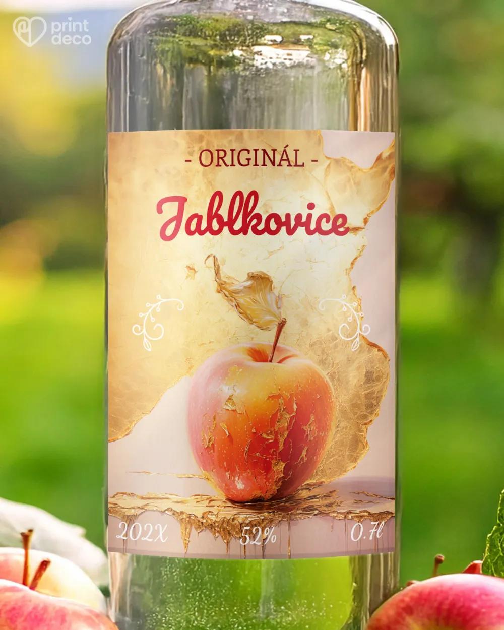Elegantní etikety na jablkovici se zlatým motivem jablka, úprava zdarma přes online editor, rychlá výroba a kvalitní tisk.