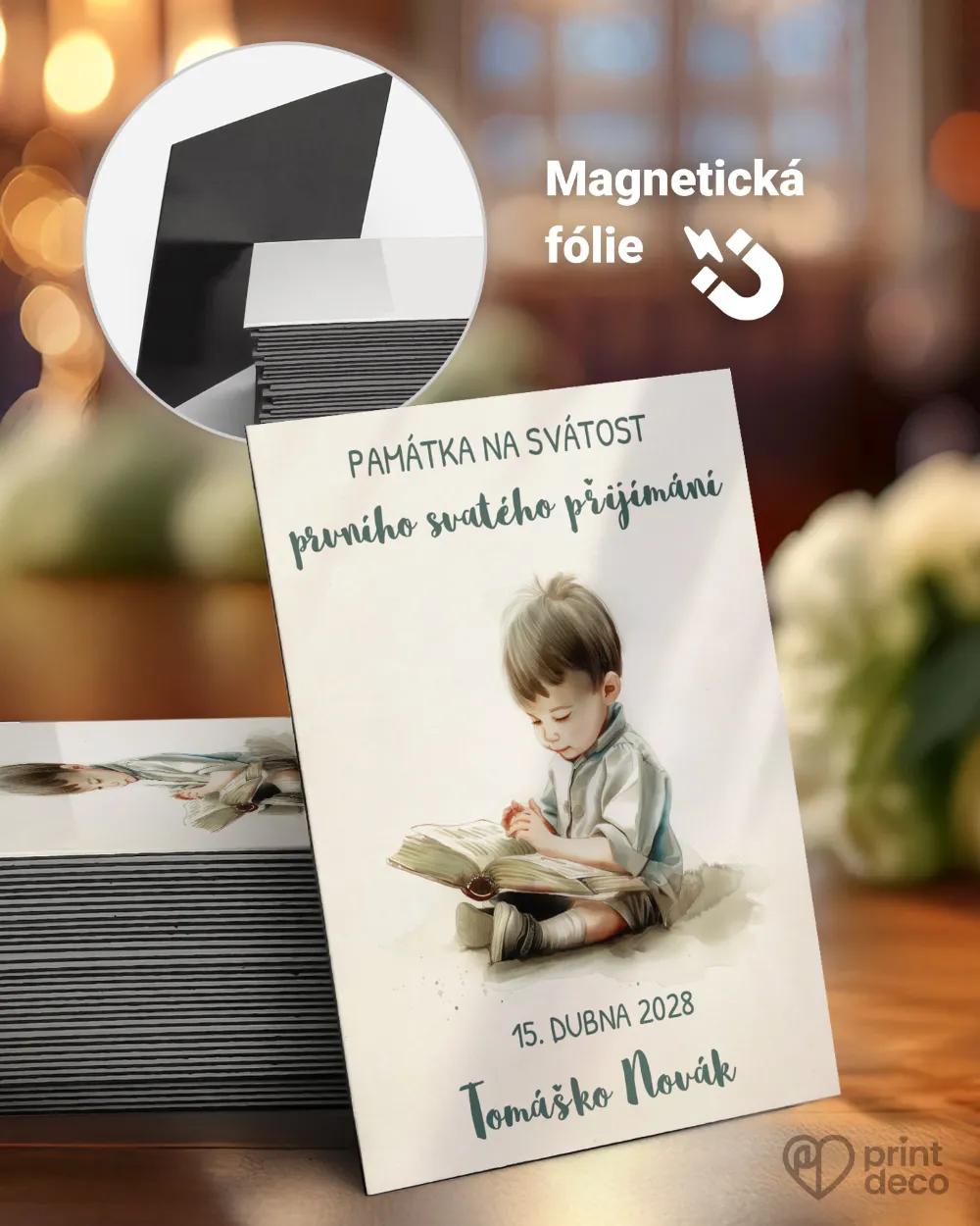Etiketa na první svaté přijímání s jemnou ilustrací chlapce čtoucího knihu je krásnou vzpomínkou a dárkem pro hosty. Úprava zdarma, expresní výroba online.