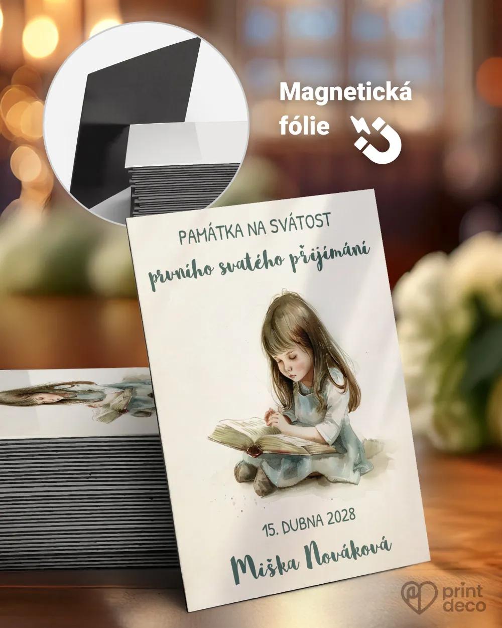 Etiketa na první svaté přijímání se stylovou ilustrací chlapce, který čte knihu v jemných barvách, je ideální památkou na tento významný den. Tento motiv je vhodný jako dárek pro hosty, kteří si chtějí uchovat milou vzpomínku. Text, jméno a datum si jednoduše upravíte zdarma v online editoru. Etiketa je tištěna na kvalitní materiál určený na lahve s vínem nebo pálenkou a vyráběna expresně, což oceníte i při objednávkách na poslední chvíli. Motiv lze sladit s dalšími tiskovinami, jako jsou pozvánky, jmenovky, etikety či samolepky ve stejném stylu.