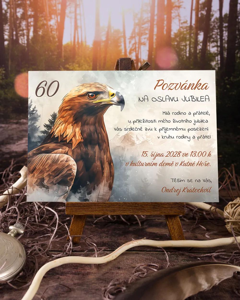 Působivá etiketa na lahev s realistickým motivem orla na pozadí hor a mlhavého lesa je skvělou volbou pro jubileum nebo mysliveckou oslavu. Orel jako symbol svobody, odvahy a moudrosti zaujme na první pohled a dodá lahvi vína či pálenky reprezentativní vzhled. Díky možnosti online úpravy si etiketu přizpůsobíte podle jména oslavence a věku. Tisk probíhá expresně a design lze sladit s dalšími tiskovinami ve stejném stylu.