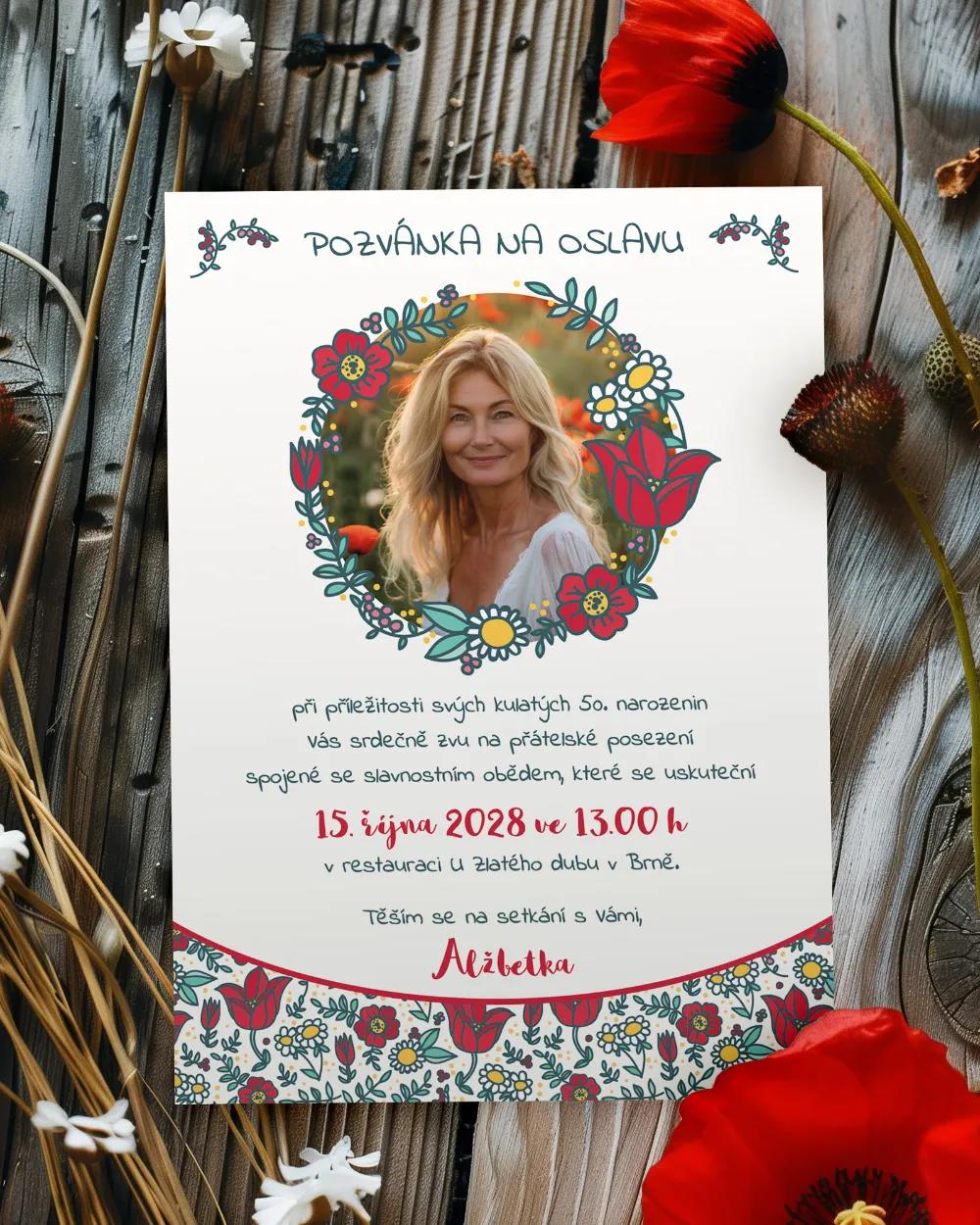 Veselá folklórní etiketa na láhev s barevným věncem a možností doplnit vlastní fotografii potěší každého oslavence. Vhodná na výslužky i jako dekorace na stůl. Jméno a další údaje si můžete upravit online zdarma. Etiketu lze sladit s pozvánkami, jmenovkami či magnetkami ve stejném motivu. Výroba expresně a v prvotřídní kvalitě.