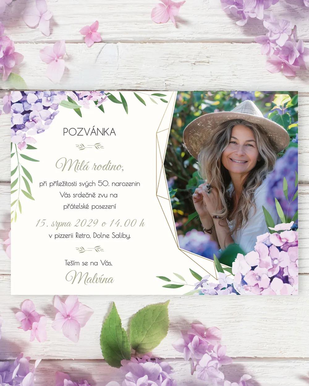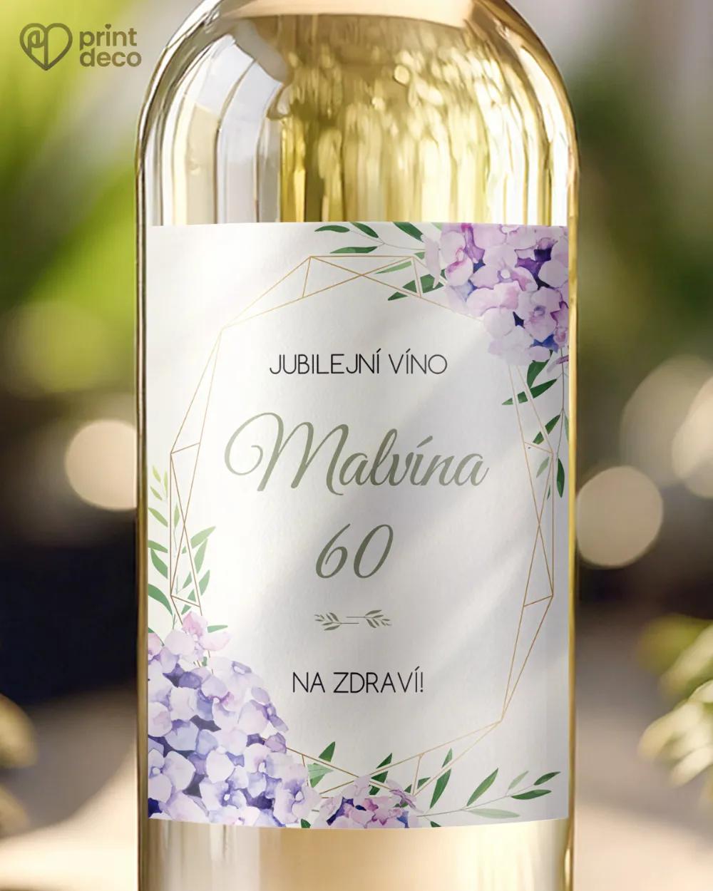 Romantická etiketa na víno s hortenziemi a místem pro vlastní fotografii. Vhodná jako dárek i výslužka. Úprava online zdarma.
