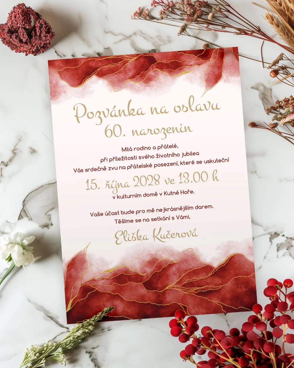 Jmenovky na stůl v bordovém akvarelovém stylu dodají slavnostní tabuli sofistikovaný a moderní nádech. Kombinace červených odstínů a jemných zlatých linií vynikne při oslavách narozenin i významných jubileí.