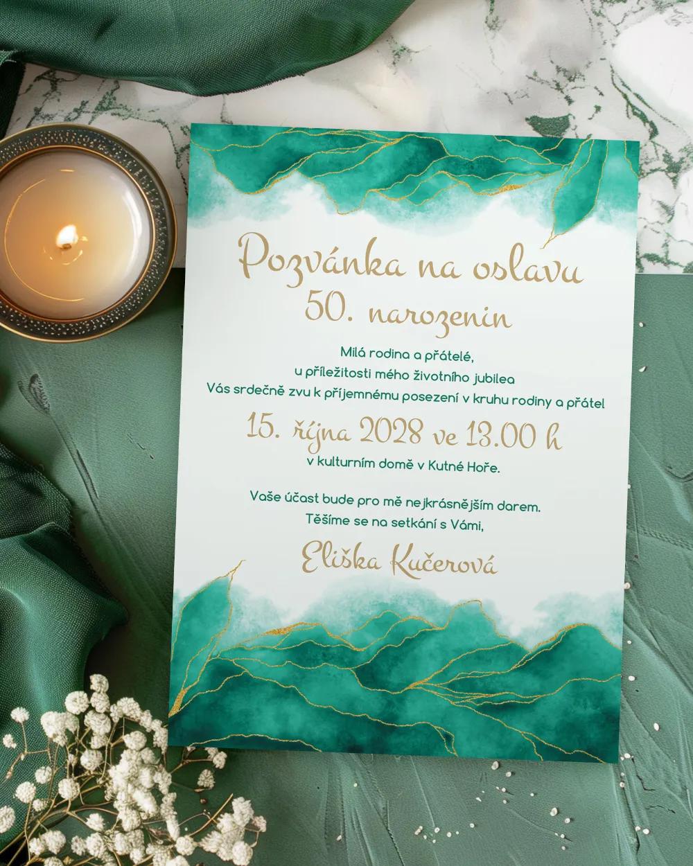 Jmenovky na stůl v sytých smaragdových odstínech dodají vaší oslavě nádech elegance a originality. Akvarelový motiv se zlatým efektem působí velmi vkusně a slavnostně.