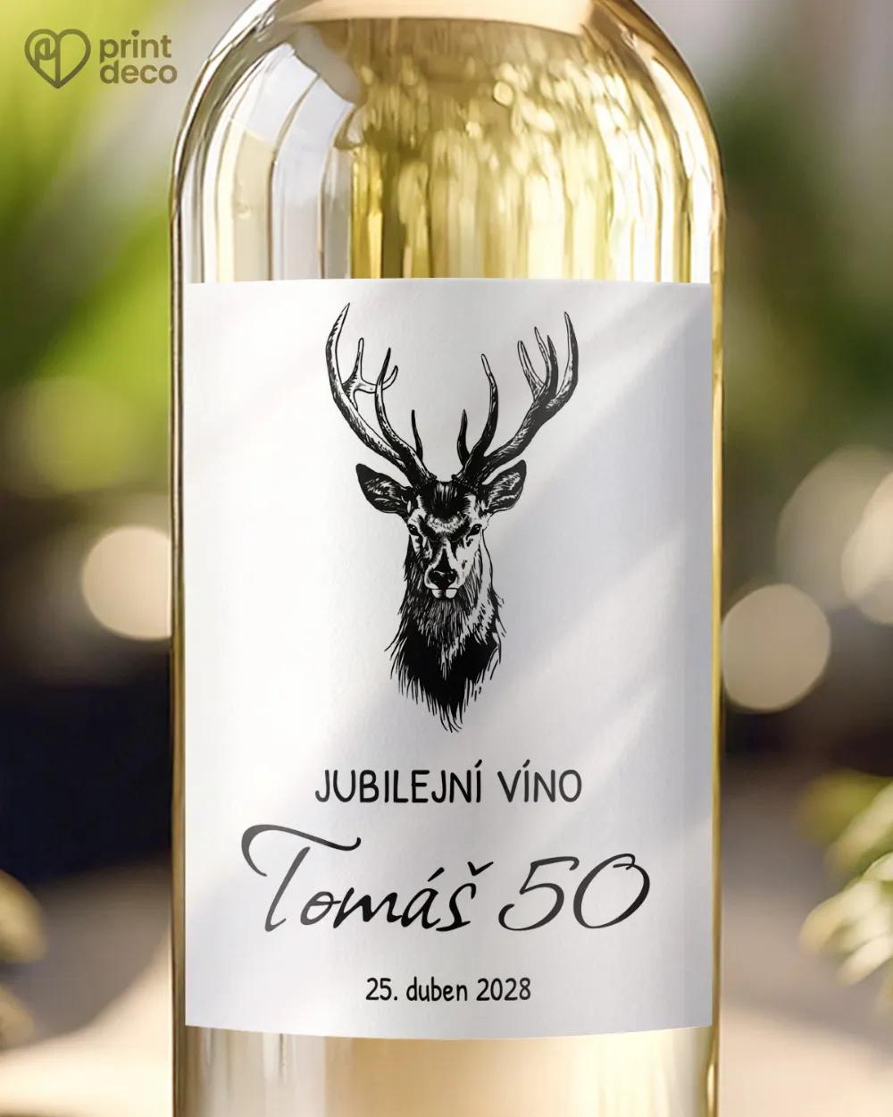 Stylové jmenovky s ručně kresleným jelenem – jednoduchý černobílý motiv na mysliveckou oslavu. Úprava zdarma, expresní tisk, ladí s tiskovinami.