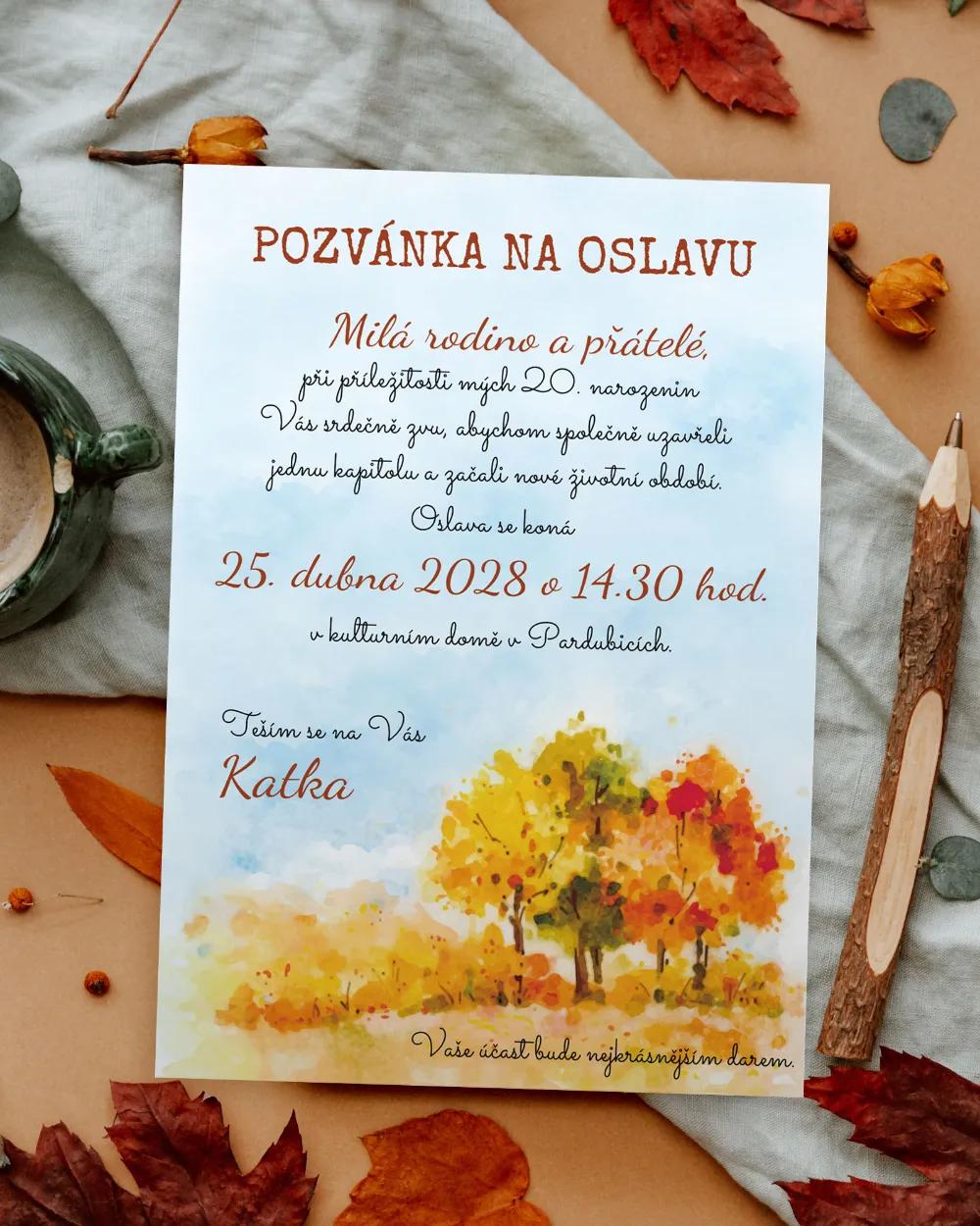 Originální jmenovka na stůl s akvarelovou ilustrací podzimních stromů vnese na slavnostní tabuli teplé a příjemné tóny. Výborně se hodí k oslavám jubilea v podzimním období – uvnitř i pod širým nebem.