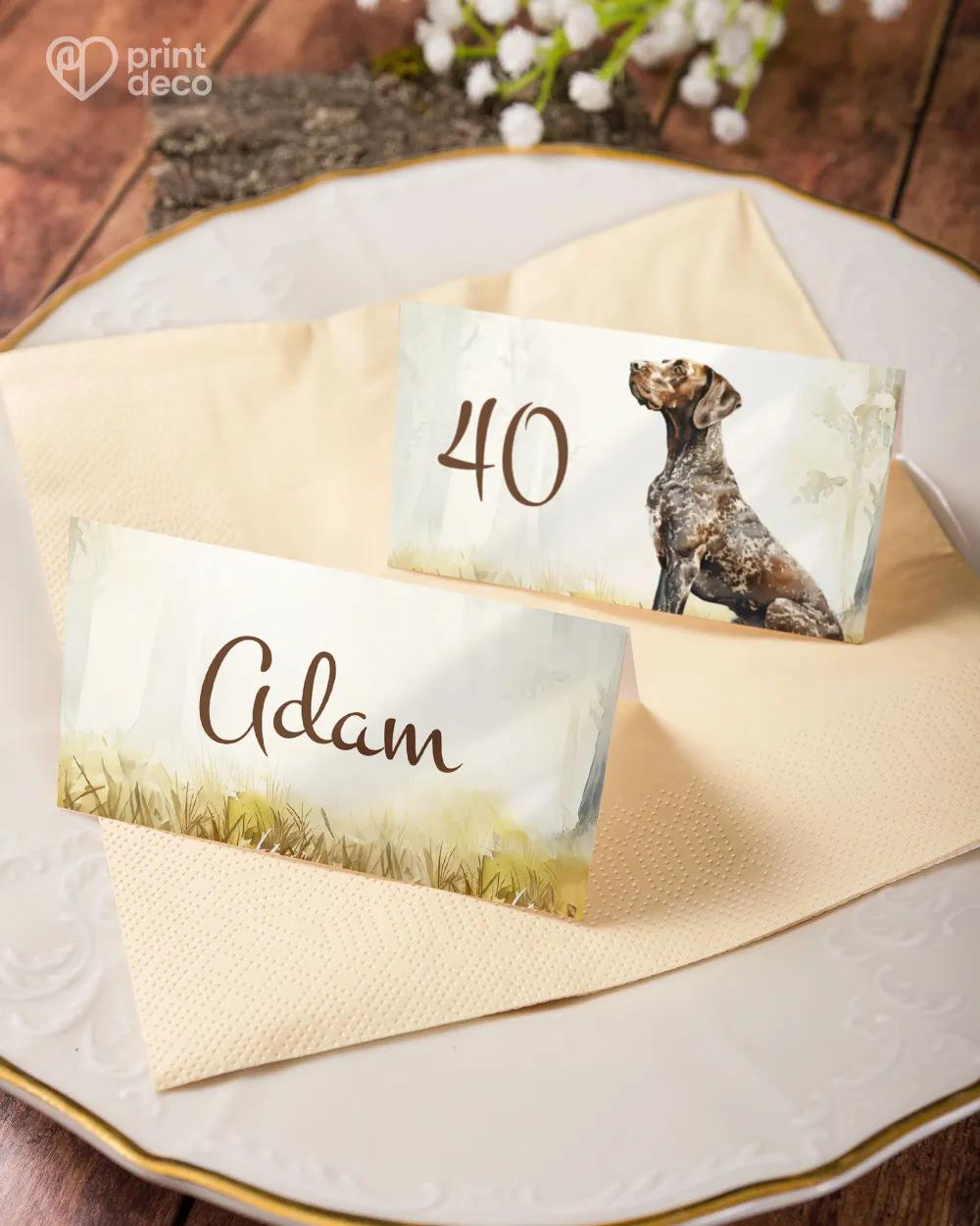 Originální jmenovky na stůl v retro stylu zaujmou decentní ilustrací tulipánů a modrobílých květů. Skvěle se hodí na rodinné oslavy jubilea s výzdobou v chladnějších modrých tónech.