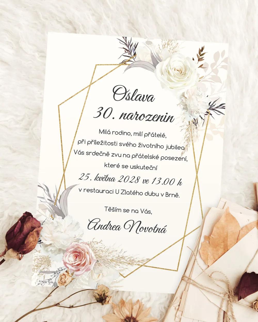 Elegantní jmenovky na stůl s jemným květinovým motivem v bílé, růžové a zlaté barvě dodají vaší oslavě slavnostní nádech. Skvěle se hodí na narozeninové jubileum v moderním, svatebním či boho stylu.