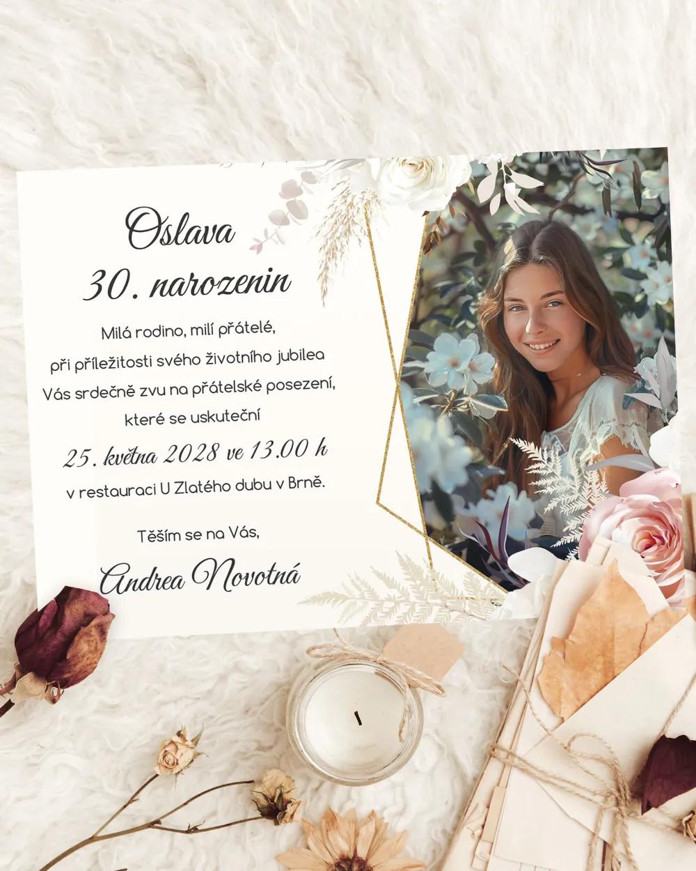 Elegantní jmenovky s květinovým motivem v bílé a růžové. Vhodné na jubileum i narozeniny. Úprava zdarma, expresní tisk, ladí s tiskovinami.
