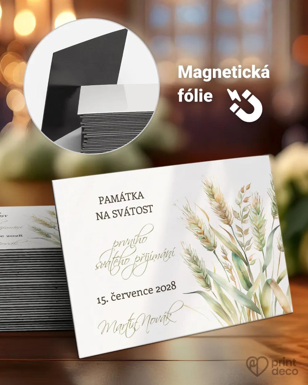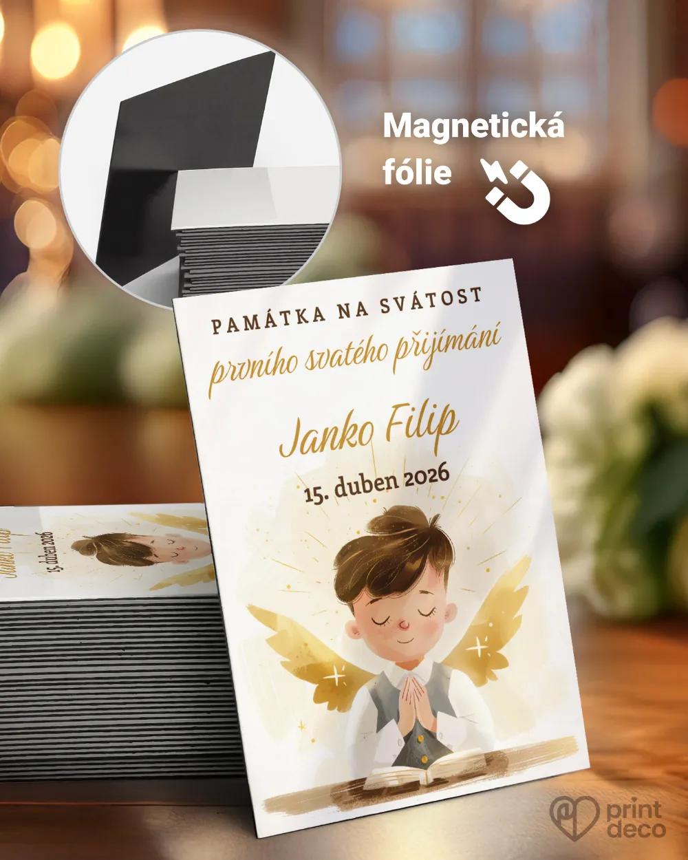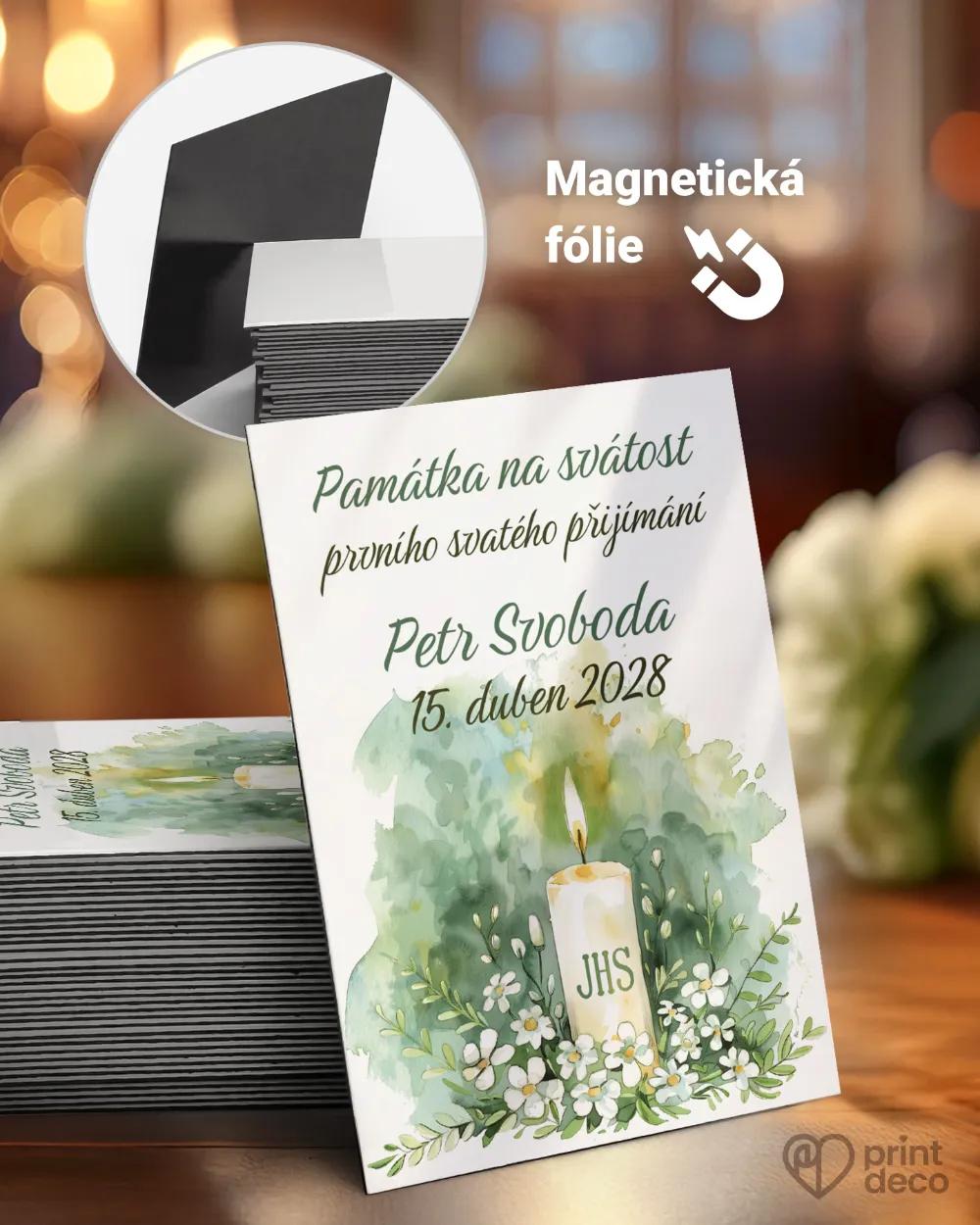 Minimalistická magnetka na svátost s modrým křížem a jemným florálním motivem je vkusnou vzpomínkou na křest, první svaté přijímání nebo biřmování. Poslouží jako originální dárek pro hosty, prarodiče, přátele i blízkou rodinu, kteří s vámi sdílejí tento významný okamžik. Vlastní údaje – jméno, datum nebo krátké věnování – si snadno a zdarma upravíte v online editoru. Magnetka je vyrobena z kvalitní magnetické fólie a připravena expresně, aby dorazila včas. Ve stejném stylu si můžete doplnit i další tiskoviny jako jmenovky, pozvánky či etikety na láhve.