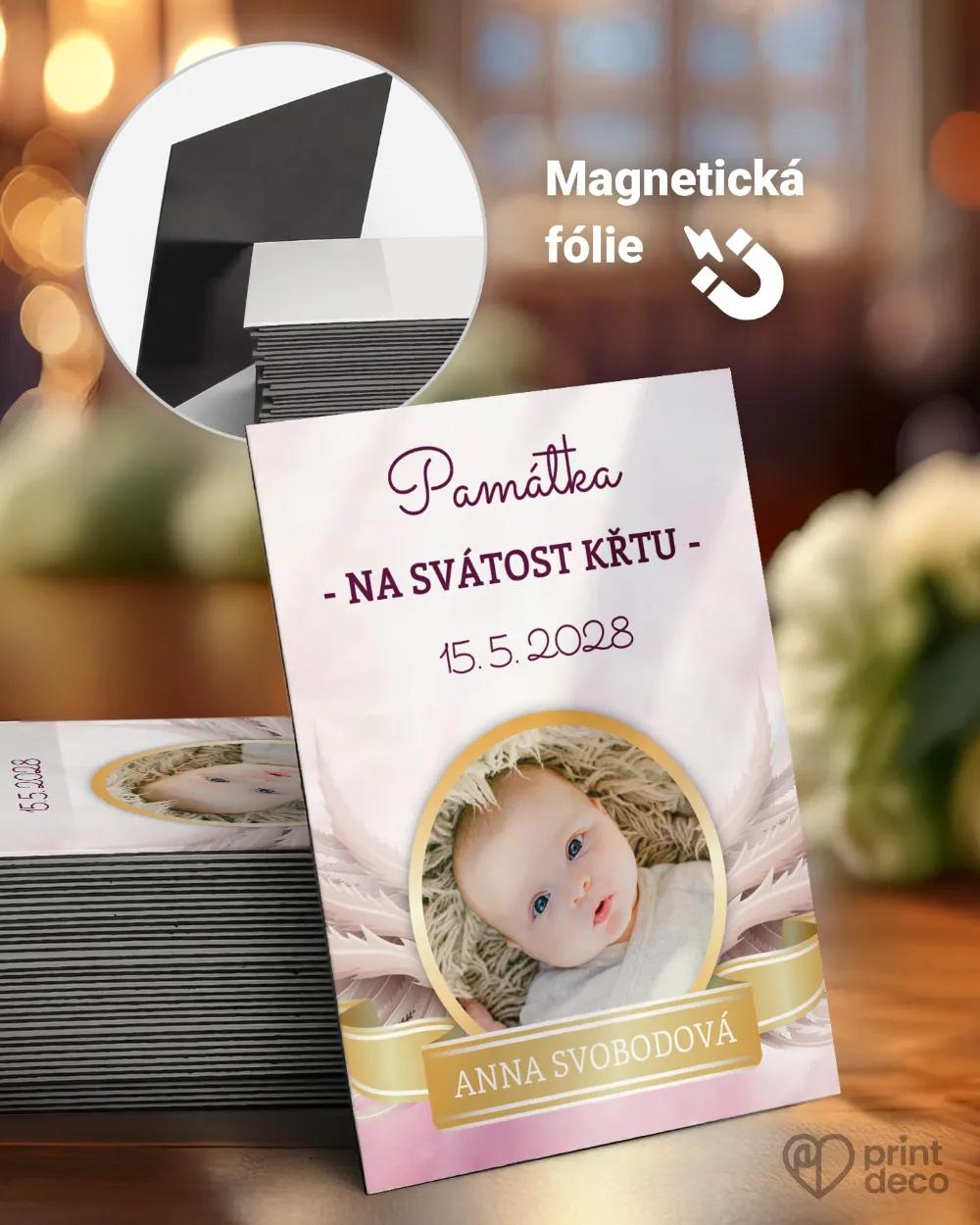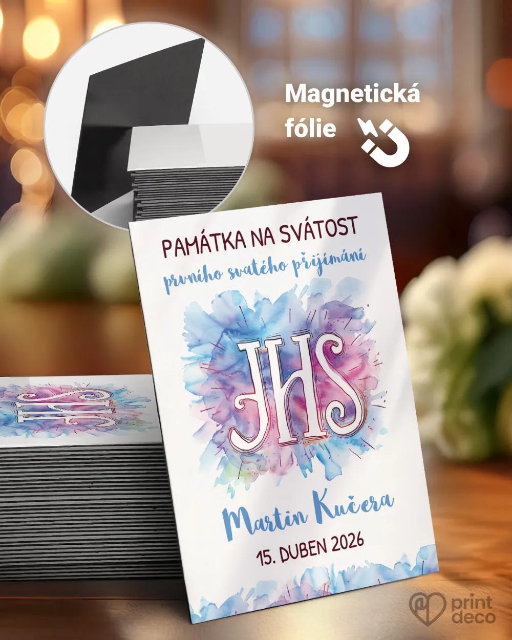 Památeční magnetka na křest, první svaté přijímání nebo biřmování v rustikálním stylu s přírodním dřevěným křížem a bohatou výzdobou modrých květin vytváří něžnou vzpomínku na výjimečný duchovní den. Je ideálním dárkem pro hosty, rodinu i přátele pozvané na slavnost. Text, jméno či datum si snadno upravíte online a bezplatně. Magnetka je vyrobena z kvalitní magnetické fólie, precizně zpracovaná a odeslaná expresně do několika dnů. Motiv lze doplnit dalšími tiskovinami ve stejném stylu – jmenovkami, etiketami, samolepkami a dalšími.
