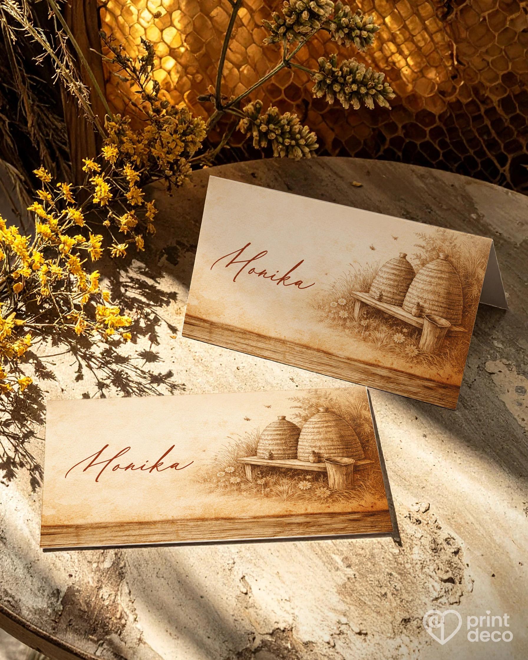 Kulatá kovová klíčenka s otvírákem na lahve s rustikálním motivem včelích úlů a dřeva je stylovou a praktickou památkou pro hosty oslavy, s úpravou zdarma přes online editor.