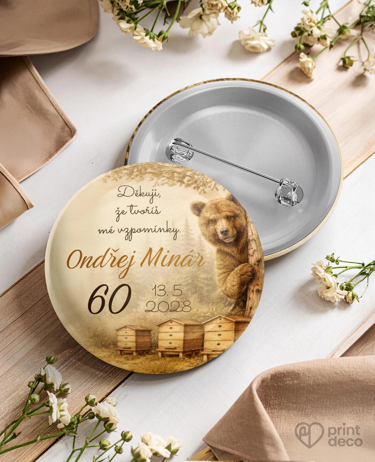 Kruhový kovový odznak – placka s motivem včelích úlů v rozkvetlé louce doplněný o výraznou dopravní značku s číslem jubilea vytváří netradiční a zároveň velmi hravý vizuál. Spojení přírodního prostředí s výrazným prvkem čísla dodává designu originalitu a dělá z něj zajímavý detail každé oslavy. Motiv osloví především milovníky včelařství, přírody a lidí se smyslem pro humor. Odznak slouží jako milá vzpomínka pro hosty, kteří se oslavy zúčastní, a zároveň jako drobnost, kterou si mohou připnout a odnést domů. Úprava zdarma přes online editor umožňuje jednoduše doplnit jméno, datum i věk podle vlastních představ, přičemž kvalitní zpracování zajišťuje pěkný vzhled a dlouhou životnost.