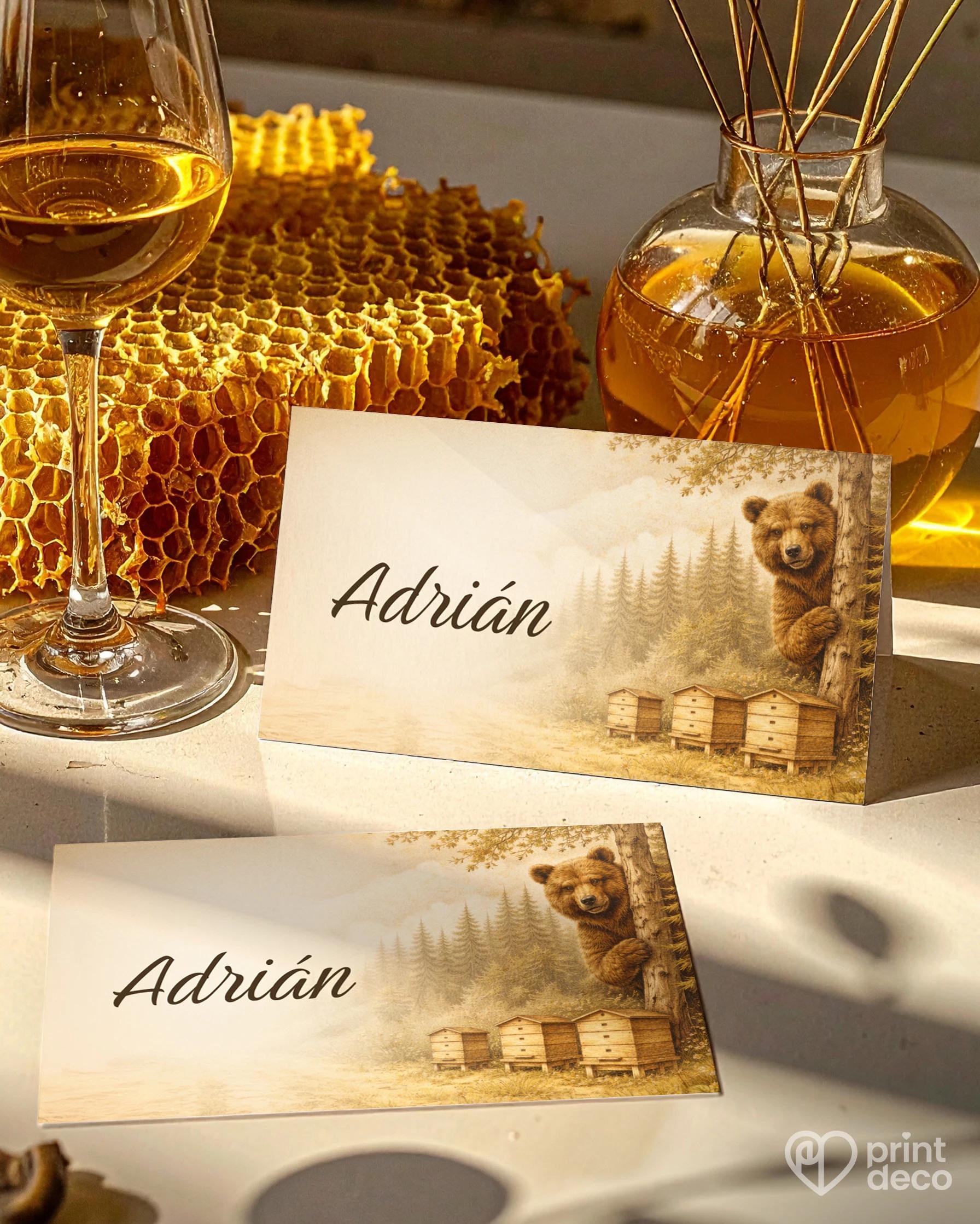 Ilustrace je laděná do teplých, zemitých tónů, které navozují atmosféru lesa, ticha a přirozeného života v přírodě. Spojení jemné kresby stromů, úlů a zvířete působí harmonicky, zároveň však přináší i milý, hravý prvek. Text se jménem, věkem a datem je citlivě zakomponován tak, aby nenarušil celkový vizuál a přirozeně jej doplňoval. Odznak je milou vzpomínkou pro hosty, kterou si mohou připnout a odnést jako připomínku příjemně stráveného dne. Úprava zdarma přes online editor umožňuje snadné přizpůsobení a kvalitní zpracování zajišťuje dlouhou životnost i pěkný výsledek.