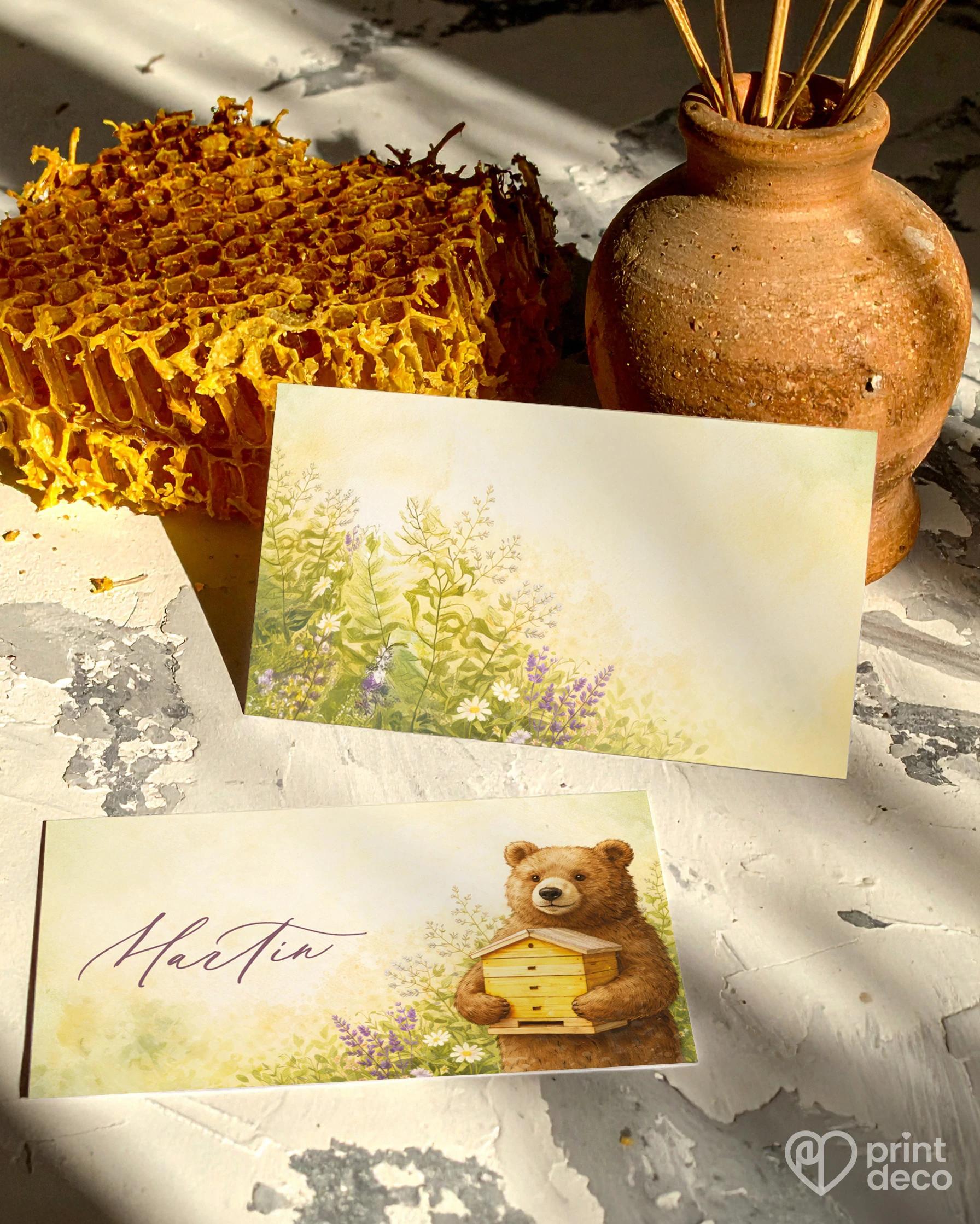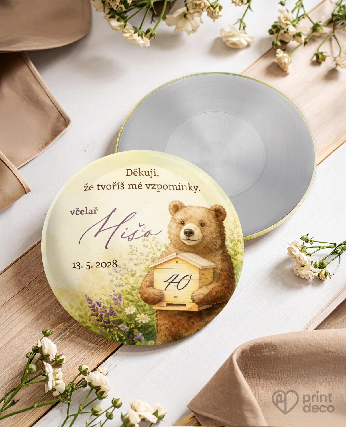 Kulaté zrcátko s roztomilým motivem medvěda včelaře a úlu je hravou vzpomínkou pro hosty oslavy s možností úpravy zdarma přes online editor.