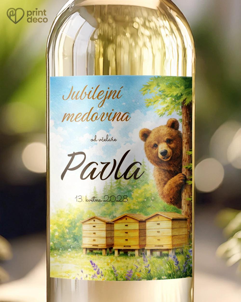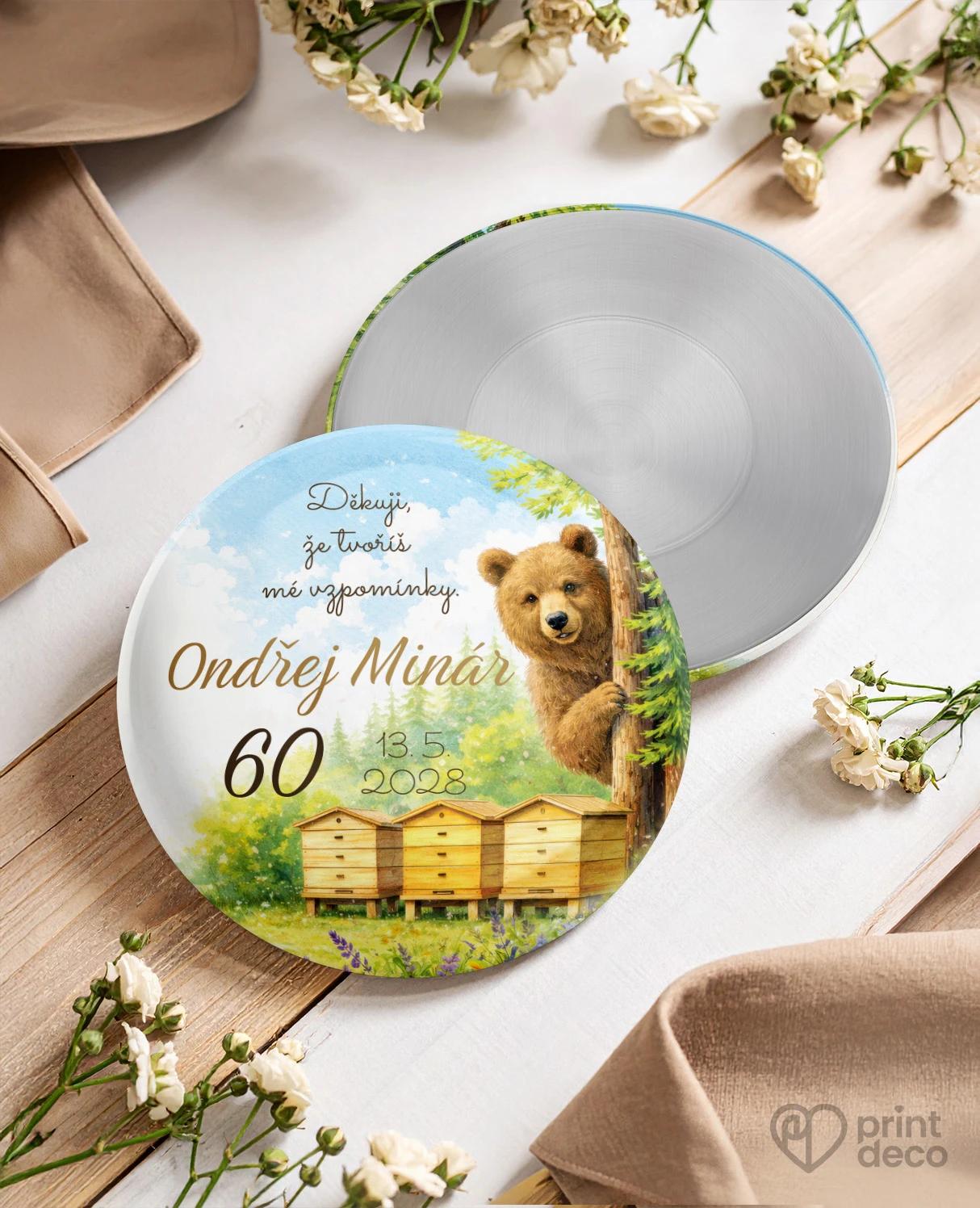 Kulaté zrcátko s barevným motivem medvěda u úlů na louce je hravou vzpomínkou pro hosty oslavy s možností úpravy zdarma přes online editor.