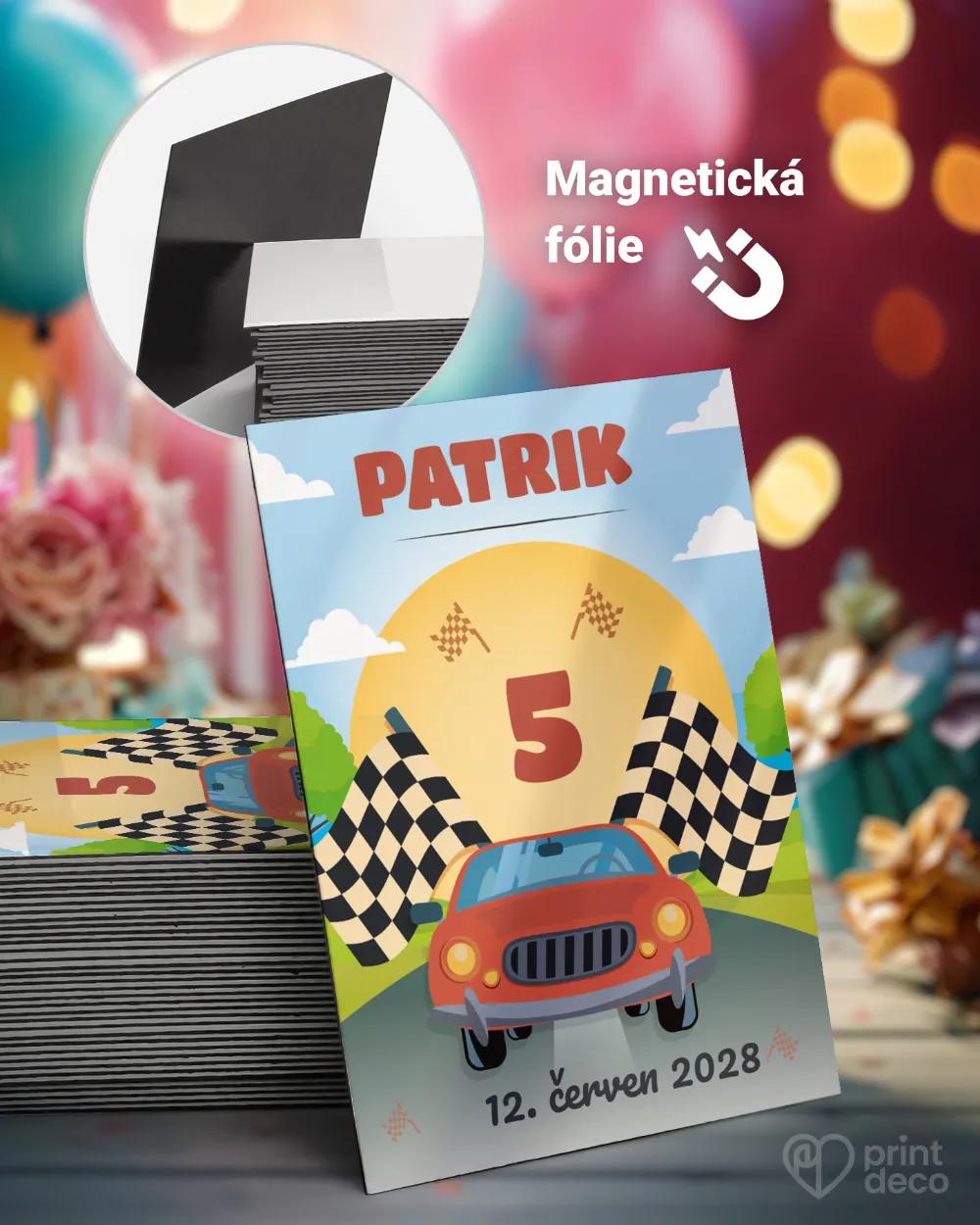 Dětská pozvánka s červeným závodním autem je skvělou volbou pro klučičí narozeninovou oslavu s motivem aut.