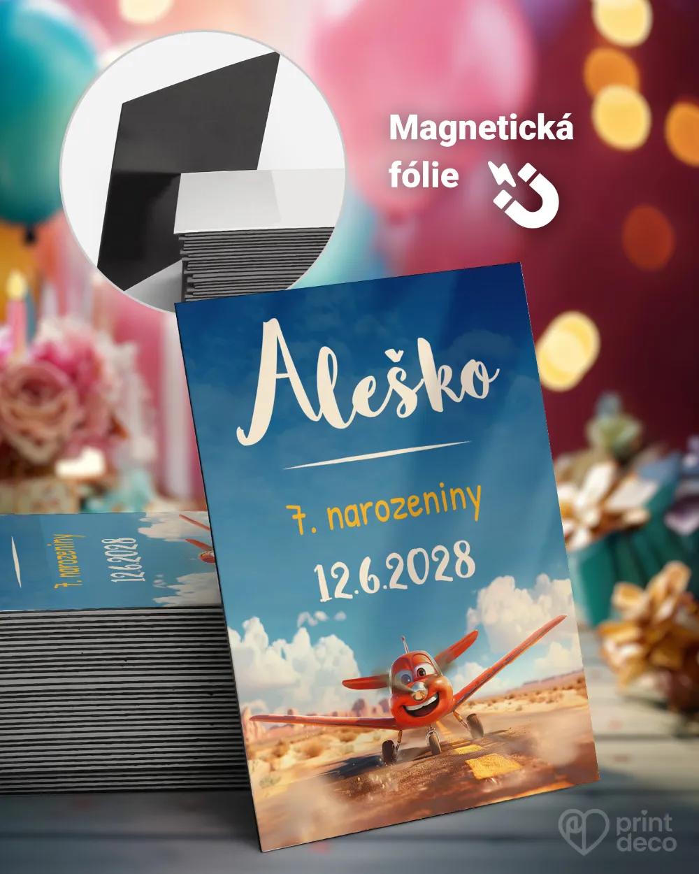 Oslavuje vaše dítě narozeniny, miluje letadla a vše, co s nimi souvisí? Máme pro vás dokonalou leteckou dětskou pozvánku! Tvoří ji pozadí vzletové dráhy, oznámení o oslavě a roztomilé kreslené letadélko. Oslavu můžete dozdobit podobnými motivy – třeba zavěšenými letadýlky – a doplnit jmenovkami nebo pamětními magnetkami ve stejném stylu z naší nabídky.