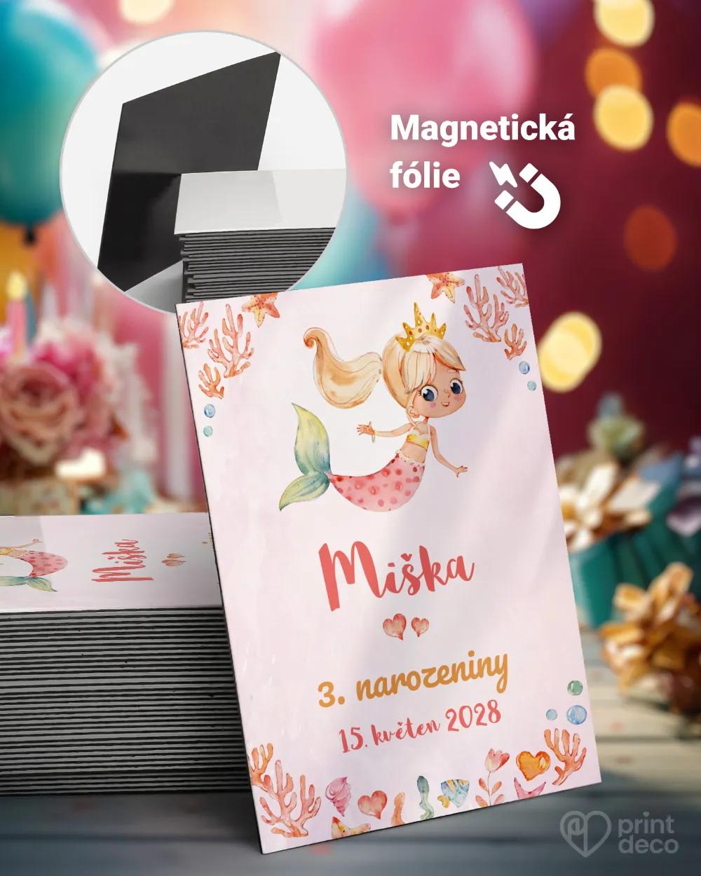 Růžová pozvánka s mořskou vílou a řasami potěší každou malou fanynku pohádek o podmořském světě. Ideální na dívčí oslavu.