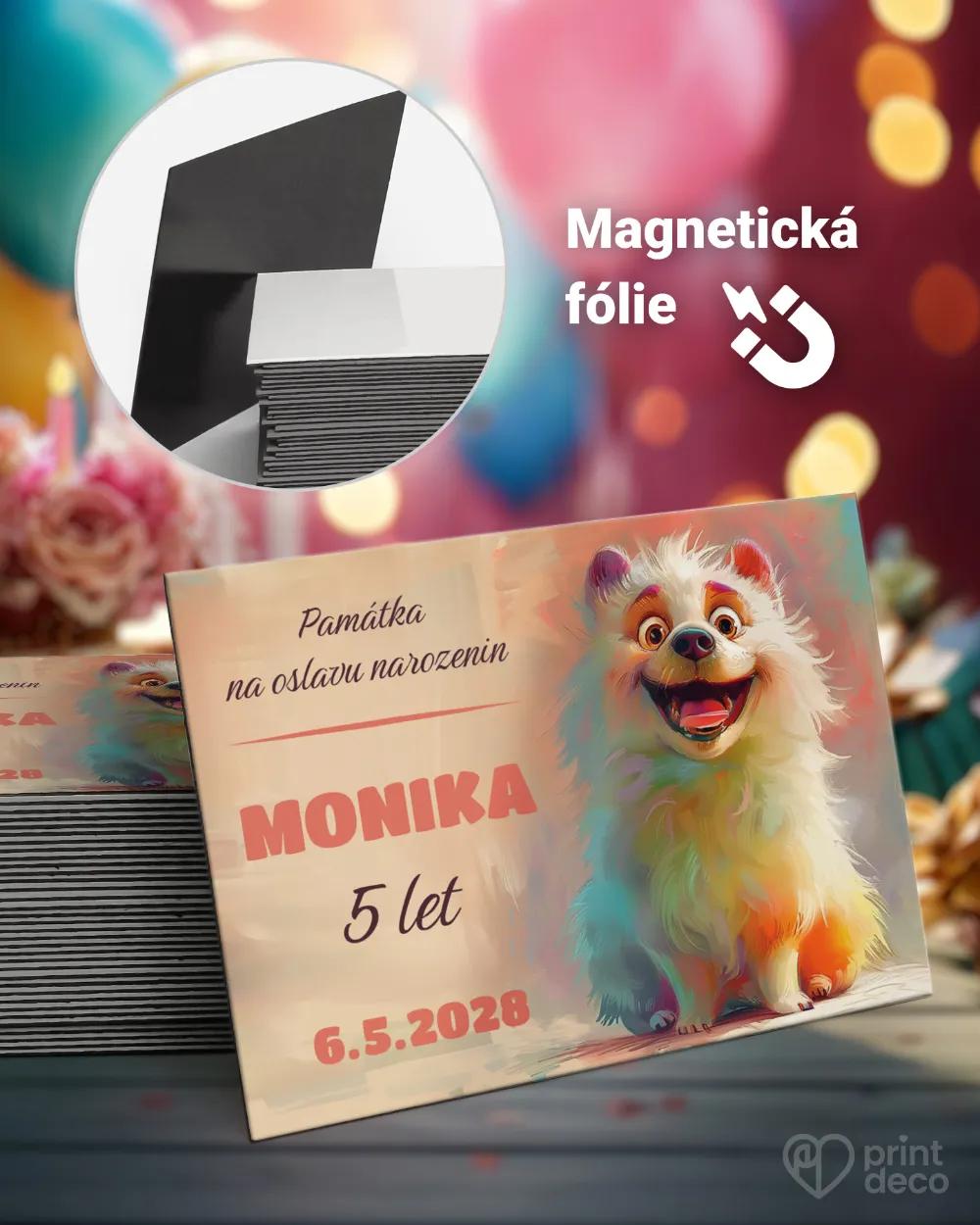 Stylová pozvánka na dětskou oslavu pro milovníky pejsků, kteří si oslavu představují spíše jako párty nebo setkání s kamarády (případně se zvířátky), než jako pohádkový den. Oslava se může konat uvnitř i venku, s jednoduchou výzdobou, a doplnit ji můžete také jmenovkami nebo pamětními magnetkami ve stejném motivu z naší nabídky.