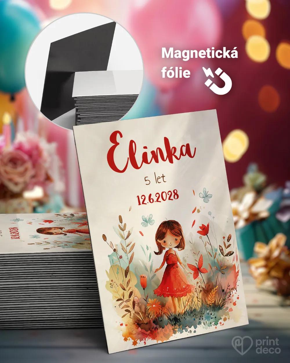 Čeká vaši holčičku narozeninová oslava na podzim a je milovnicí květin, listí a podzimních barev? Tato dětská pozvánka se jí zaručeně zalíbí. Podzimní odstíny, kvítky, motýlci a postavička víly – oslavenkyně – uprostřed tvoří krásné spojení, které hosty pozve na jedinečnou oslavu. Doplňte ji jmenovkami nebo pamětními magnetkami ve stejném motivu a vytvořte sladěný celek.