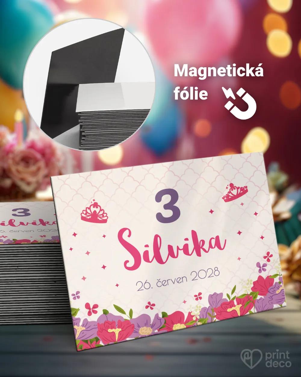 Princeznovský sen – přesně taková je tato pozvánka na dětskou oslavu v růžových barvách, doplněná o korunky a originální text pozvání, která potěší nejen oslavenkyni, ale i všechny pozvané. Pokud svým hostům, zejména malým slečnám, dáte vědět, že mohou přijít v princeznovských šatech, nebo pokud si speciální šaty oblékne samotná oslavenkyně, a k tomu si z naší nabídky vyberete i pamětní magnetky či jmenovky ve stejném motivu, garantujeme vám nezapomenutelný zážitek.