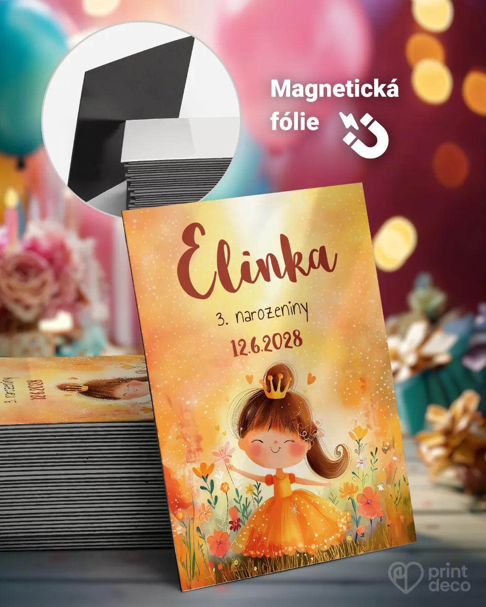 Princeznovská párty – je to sen vaší holčičky? My vám pomůžeme vytvořit dokonalou pozvánku právě pro tuto kouzelnou oslavu. Magické pozadí, květiny a roztomilá princezna v krásných šatech – to je to, co potěší nejen oslavenkyni, ale i všechny její hosty. Doplňte výzdobu o pamětní magnetky nebo jmenovky ve stejném motivu z naší nabídky a princeznovský sen je na světě.