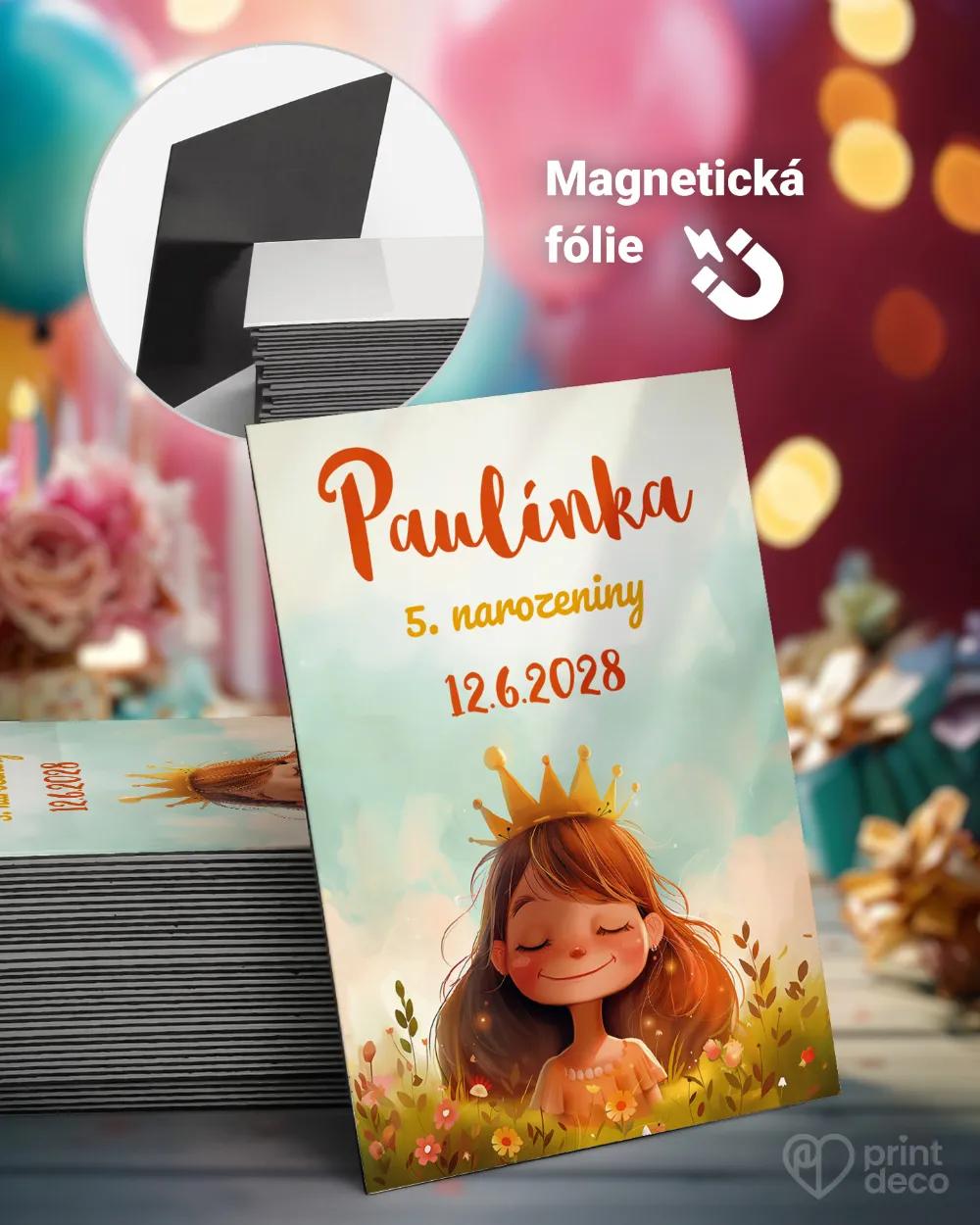 Máte doma oslavenkyni, která se v přírodě cítí jako doma a jako královna? Tato dětská pozvánka je určena právě jí. Holčička s korunkou, obklopená přírodou a doplněná oznámením o oslavě, tvoří vkusnou pozvánku na dětskou oslavu, která se ponese v přírodním duchu – nebo se bude dokonce odehrávat přímo v přírodě. V naší nabídce najdete i pamětní magnetky či jmenovky ve stejném motivu, a vše tak bude dokonale sladěné.
