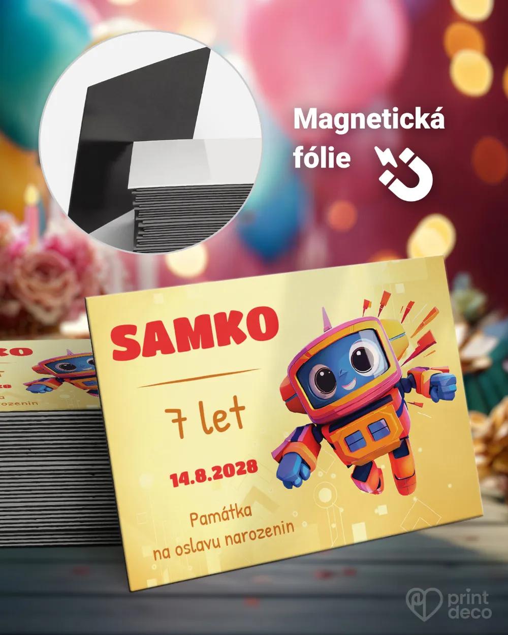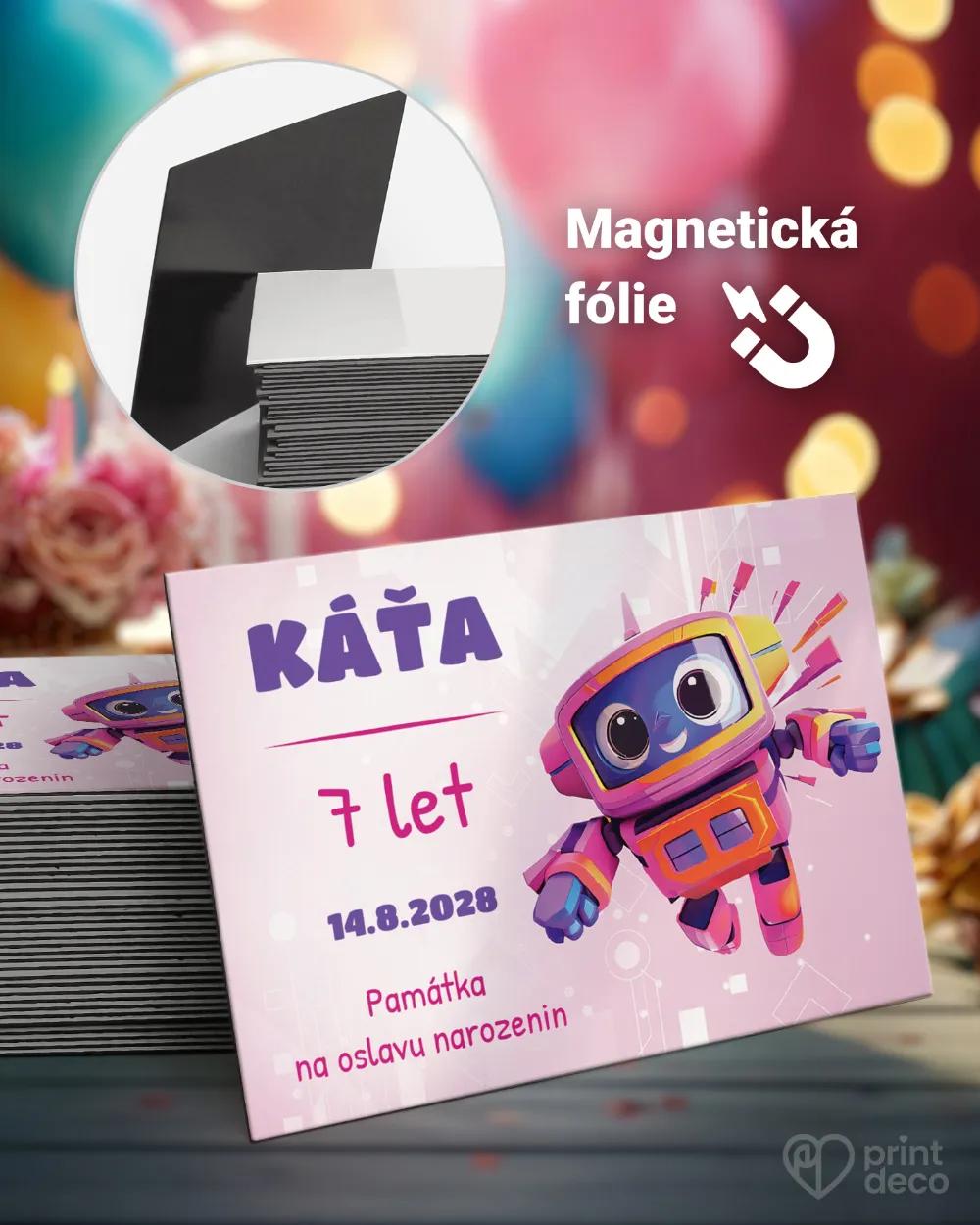 Pokud hledáte dětskou pozvánku pro milovníky robotů, právě jste ji našli. Jednoduchá, ale přitom originální pozvánka v růžové barvě s oznámením o oslavě a postavičkou robota určitě potěší oslavence i jeho hosty. V naší nabídce si můžete vybrat i pamětní magnetky nebo jmenovky ve stejném motivu – a všechno bude dokonalé.