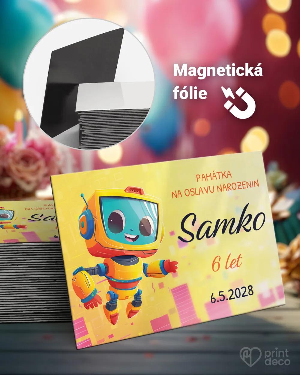 Pro milovníky robotů nebo televize máme skvělou pozvánku na jejich oslavu! Dětská pozvánka je laděná do žluté barvy, obsahuje pozvání na oslavu a jako hlavní prvek zobrazuje postavičku robota. U nás si navíc můžete vybrat pamětní magnetky nebo jmenovky ve stejném motivu – a všechno bude dokonale sladěné.