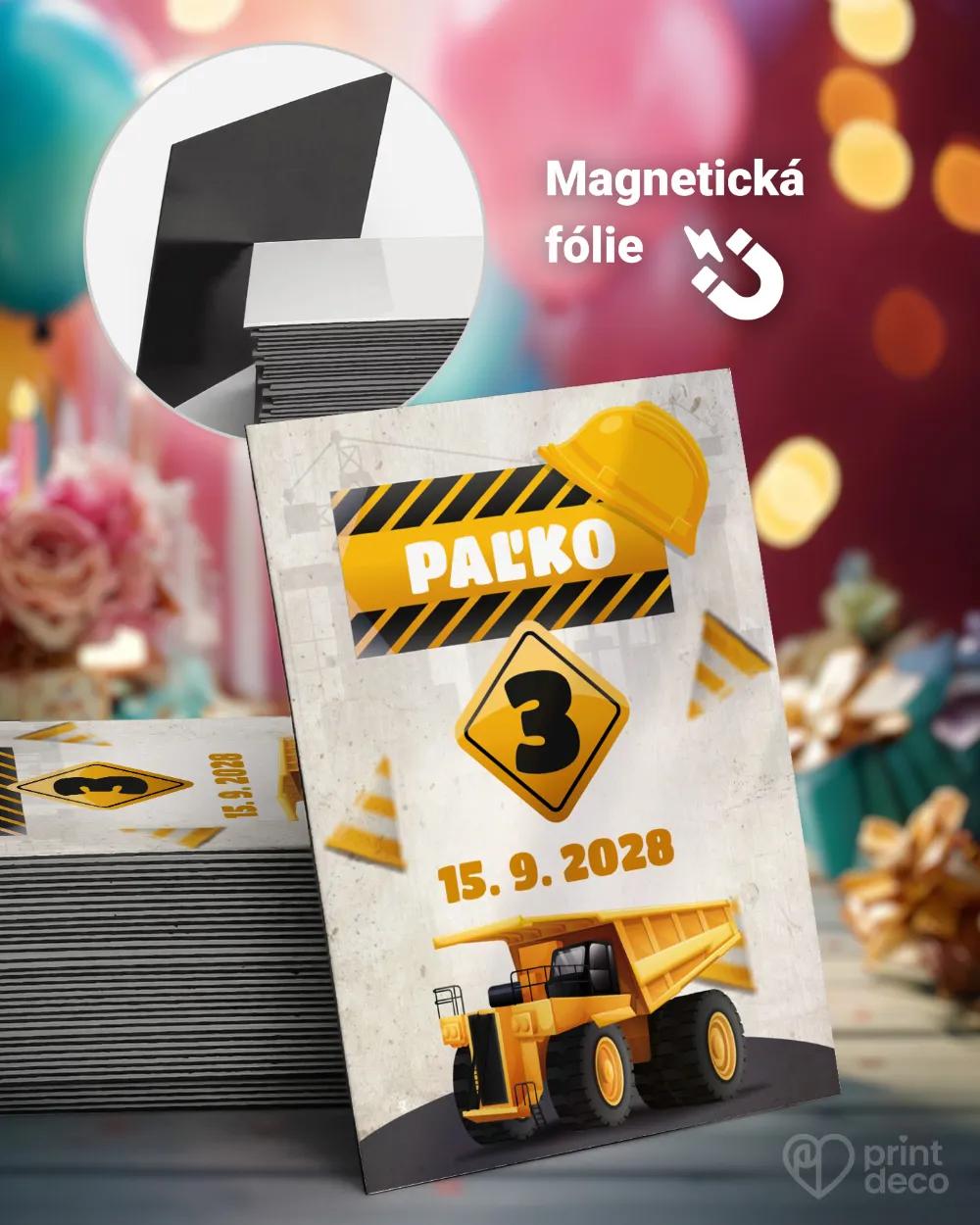 Pokud vaše dítě touží pracovat na stavbě, celé dny si hraje s nákladními auty a je jejich velkým fanouškem, nabízíme vám pozvánku na dětskou oslavu, která mu jeho sny alespoň částečně splní. Hlavním prvkem pozvánky je oranžové nákladní auto v prostředí stavby, doplněné dopravními kužely a samozřejmě oznámením o oslavě. Výzdobu můžete doladit v podobných barvách a také ji doplnit jmenovkami nebo pamětními magnetkami ve stejném motivu z naší nabídky.