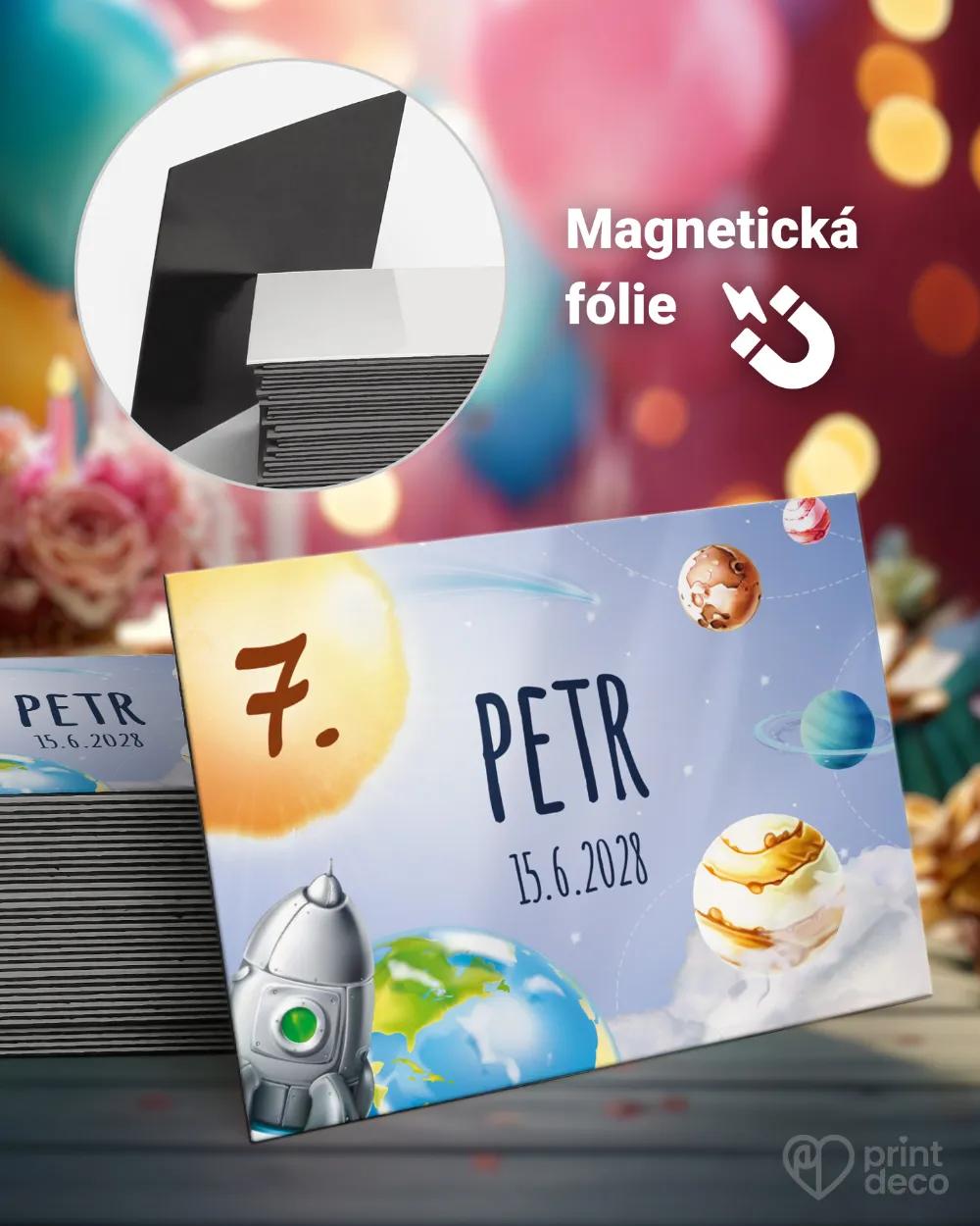Dětská pozvánka jako stvořená pro milovníka nebo milovnici vesmíru, planet a všech, kdo sní o tom, že se do vesmíru jednou podívají. I když zatím ne doopravdy, alespoň na pozvánce se do něj přenesou všichni pozvaní hosté – protože pozvánku tvoří vesmírné prostředí, planety, slunce a raketa letící do vesmíru. Tento originální motiv můžete doplnit jmenovkami nebo pamětními magnetkami ve stejném stylu z naší nabídky.