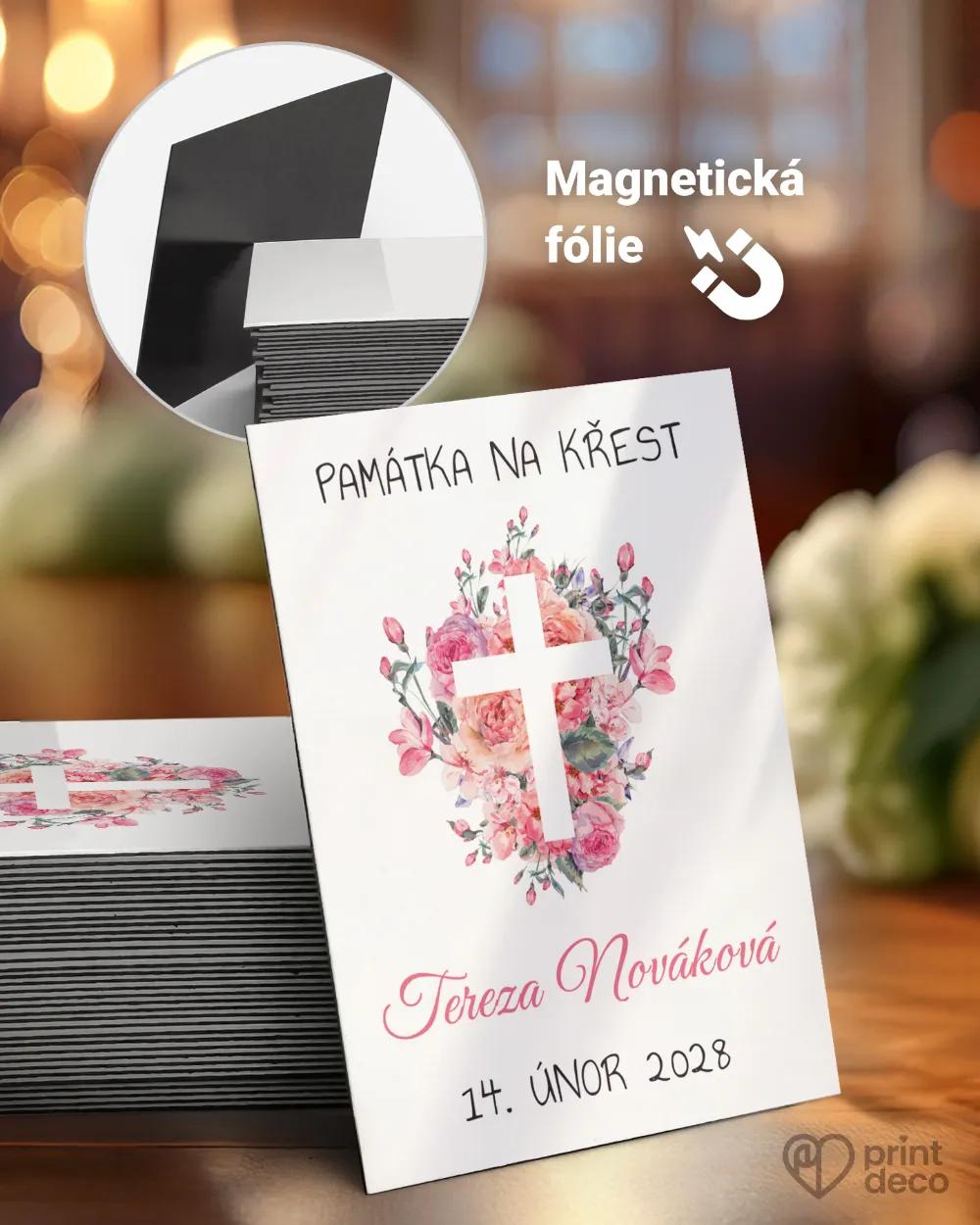 Nádherné a jemné dívčí oznámení vhodné ke křtu nebo svátostem, jako je biřmování, první svaté přijímání nebo konfirmace, zdobí krásné růžové květy s bílým křížem uprostřed. I následné posezení při těchto příležitostech může být laděno v těchto barvách a doplněno dalšími tiskovinami z naší nabídky ve stejném motivu – například etiketami na lahve či památečními magnetkami – a vše tak bude dokonale sladěné.