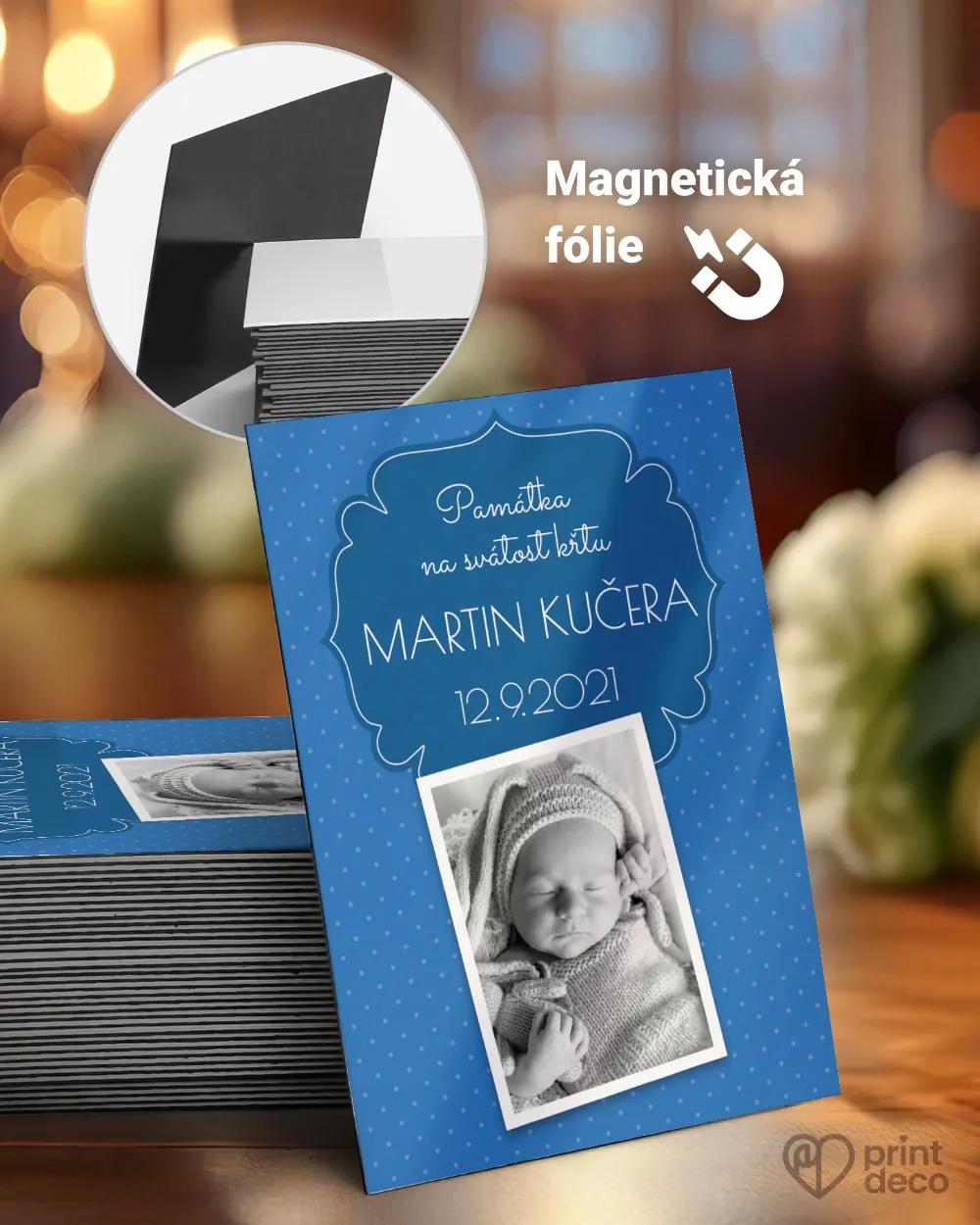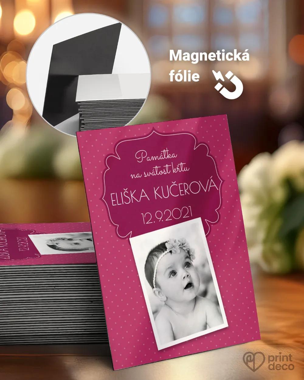 Jednoduchá pozvánka laděná do růžové nebo modré barvy podle toho, zda se jedná o dívku či chlapce, doplněná fotografiemi, bude skvělou volbou zejména ke křtu, ale také ke svátostem jako je první svaté přijímání, biřmování či konfirmace. Protože pozvánka neobsahuje žádné náboženské motivy, může být využita i k vítání občánků pořádanému obcí. Doplnit ji můžete také o další tiskoviny z naší nabídky, jako jsou etikety na lahve či památeční magnetky.
