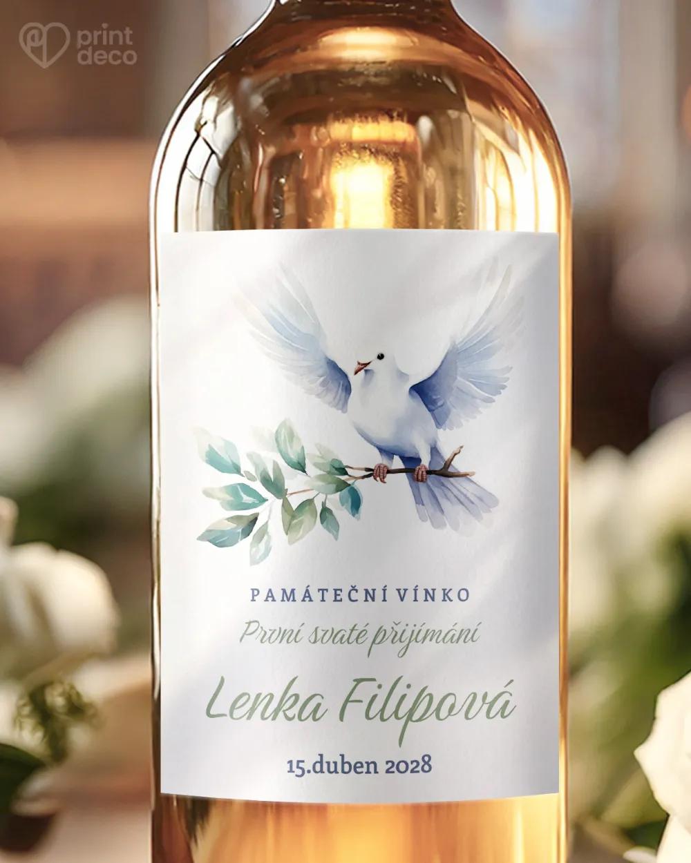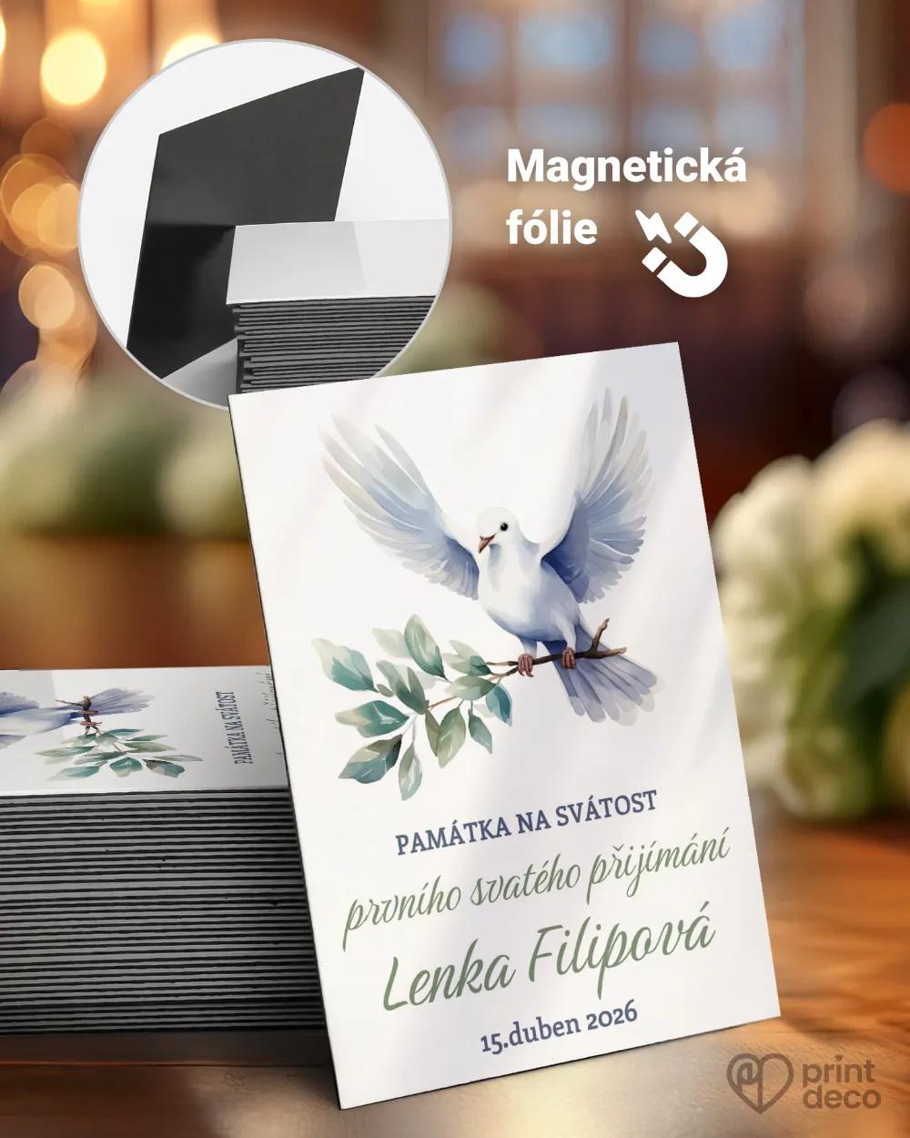Jemné a vznešené pozvání ke svátosti křtu, prvního svatého přijímání, biřmování či konfirmace. Dominantním prvkem pozvánky je bílá holubice nesoucí ratolest, která se vznáší nad textem pozvání ke svátosti. Pro dokonalé sladění doporučujeme doplnit pozvánku také památečními magnetkami či etiketami na lahve ve stejném motivu z naší nabídky, a celý váš den se tak ponese ve stejném slavnostním duchu.