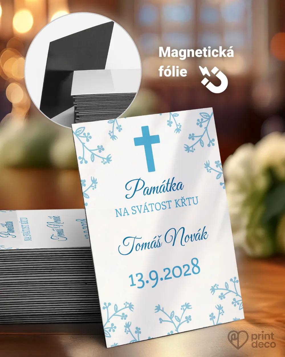 Jemné a decentní pozvání ke svátostem v modré nebo růžové barvě dotvářejí drobné kvítky, symbol křížku a ozdoba v podobě malé mašličky. Tuto pozvánku lze využít ke křtu, ale i ke svátostem, jako je první svaté přijímání, biřmování či konfirmace. Následné setkání nebo posezení s rodinou může být rovněž laděno do modré či růžové, a v těchto motivech si u nás můžete objednat také etikety na lahve nebo památeční magnetky.