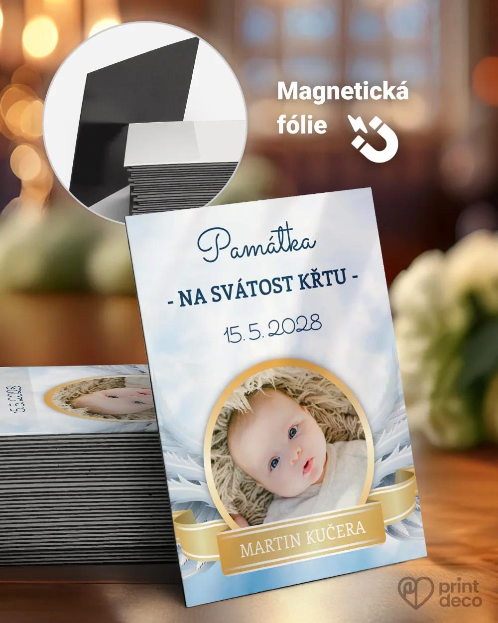 Pozvánka ke svátostem v jemné růžovo-bílé barvě, v níž je hlavním prvkem fotografie dítěte, které bude přistupovat ke svátosti, v kruhu se zlatou stuhou a krásnou dekorací s andělskými křídly. Tuto pozvánku vám můžeme přizpůsobit nejen pro svátost křtu, ale i pro první svaté přijímání, biřmování či konfirmaci, a doplnit ji rovněž o další tiskoviny ve stejném motivu, jako jsou například etikety na lahve nebo památeční magnetky.
