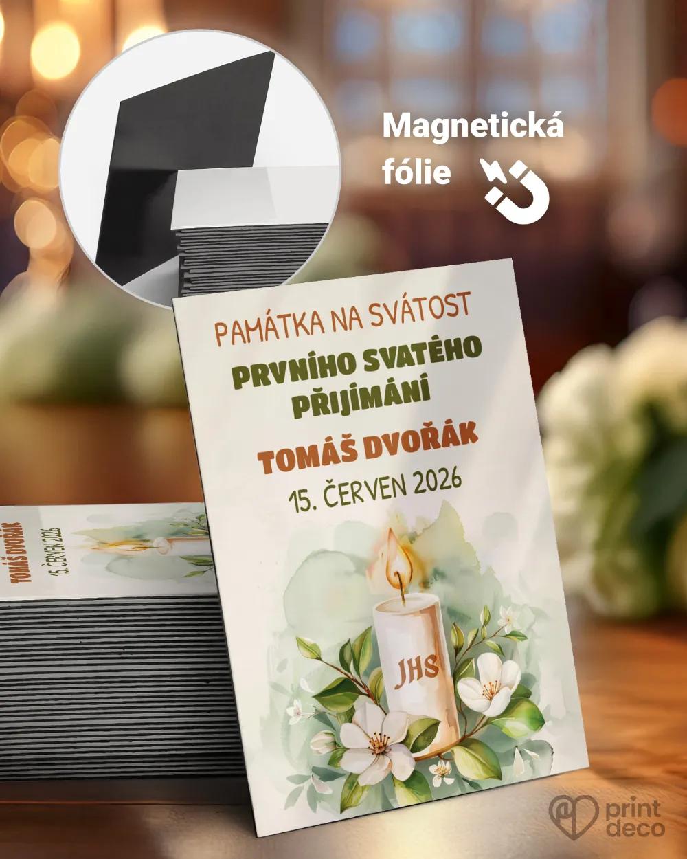 Přírodní pozvánka ke svátostem jako křest, první svaté přijímání, biřmování či konfirmace je tvořena pozváním v zeleno-hnědém tónu, bílým a zeleným pozadím, na kterém vyniká hořící svíce s nápisem zkratky jména Ježíš v obklopení krásných větviček s lístky a květy. Tento výjimečný den můžete doladit výzdobou v podobném stylu a doplnit ho o etikety na lahve či památeční magnetky ve stejném motivu z naší nabídky.