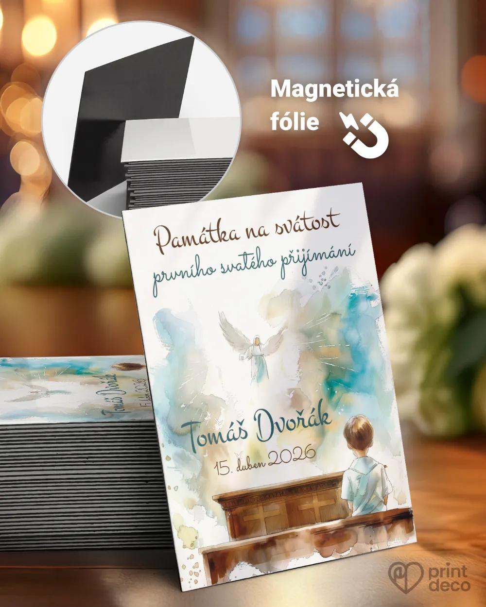 Zajímavé, ale stále vkusné pozvání ke svátostem jako je křest, první svaté přijímání, biřmování či konfirmace. Tvoří ho bílo-hnědo-modré pozadí, na kterém vyniká anděl, pod nímž v lavici klečí modlící se děvčátko. Ve stejných tónech se může nést i výzdoba vašeho slavnostního dne, kterou lze doplnit například etiketami na lahve či památečními magnetkami ve stejném motivu z naší nabídky.