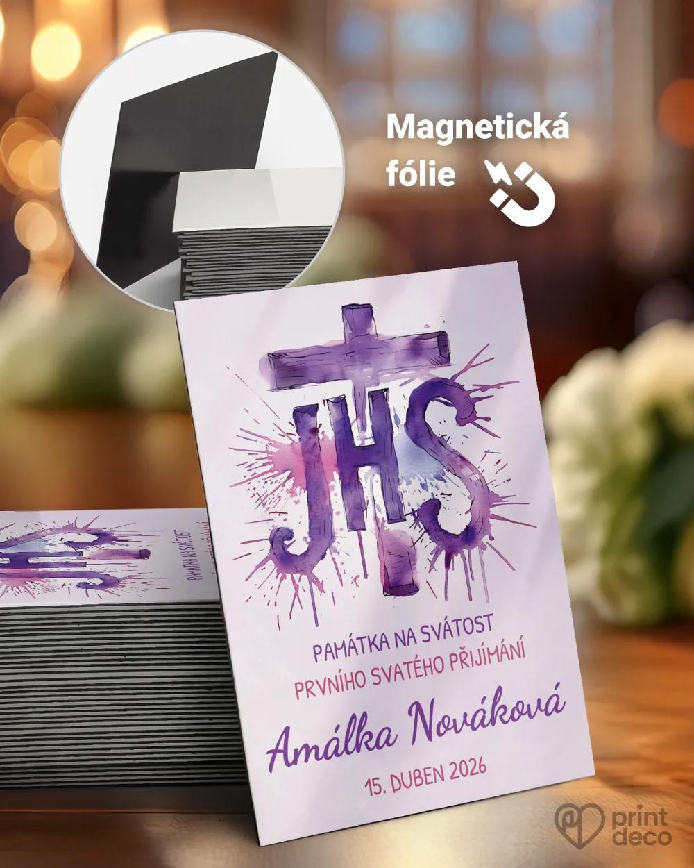 Zajímavá pozvánka ve fialovém tónu určená ke svátostem jako je křest, první svaté přijímání, biřmování nebo konfirmace je zdobena netradičním ztvárněním kříže a zkratky jména Ježíš ve fialové barvě. Pro sladěný celek si u nás můžete vybrat také etikety na lahve či památeční magnetky ve stejném motivu a v těchto barvách můžete sladit i výzdobu následného posezení.