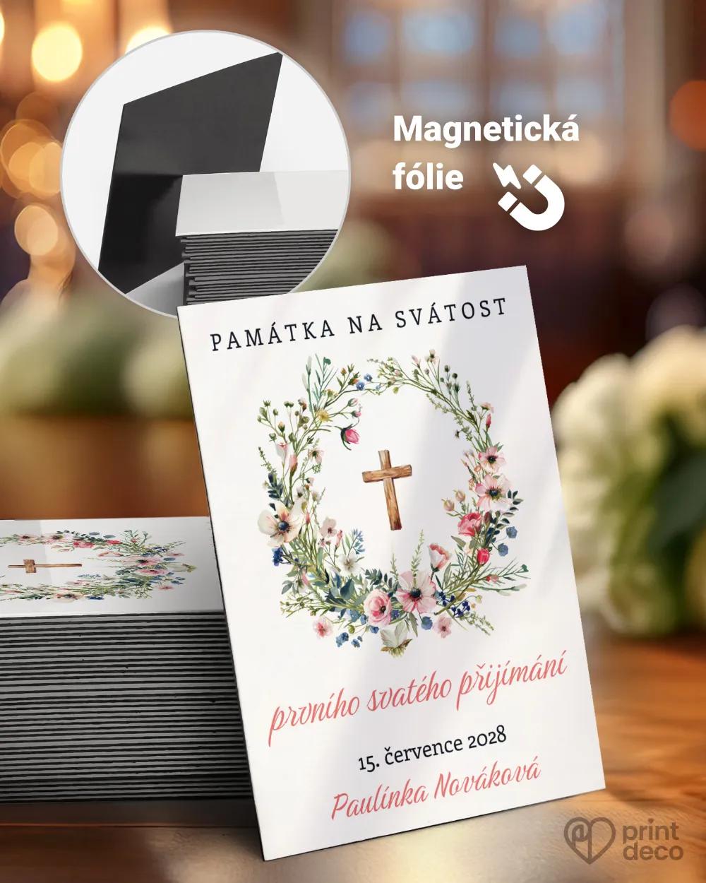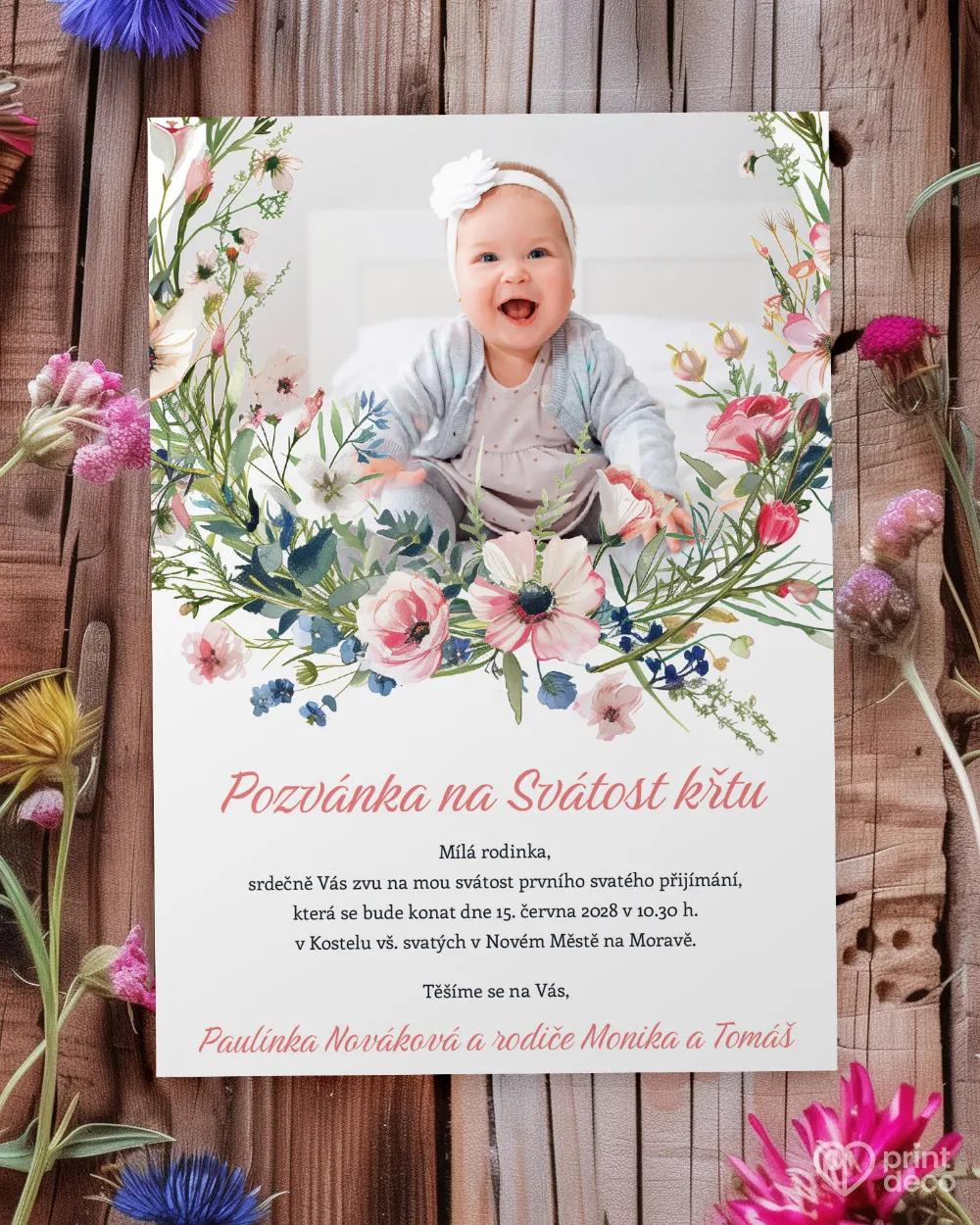 Vkusné pozvání v přírodním motivu v růžových tónech, vhodné ke svátostem jako je křest, první svaté přijímání, biřmování nebo konfirmace. Bílé pozadí pozvánky zvýrazňuje dřevěný kříž, který se nachází uprostřed věnce z lučních květin. Součástí motivu je také fotografie oslavované osoby díky níž pozvání působí osobně a výjimečně. Tyto květiny můžete využít i k výzdobě hostiny a z naší nabídky si vybrat další tiskoviny ve stejném motivu, jako například památeční magnetky nebo etikety na lahve – a vše bude dokonale sladěné.