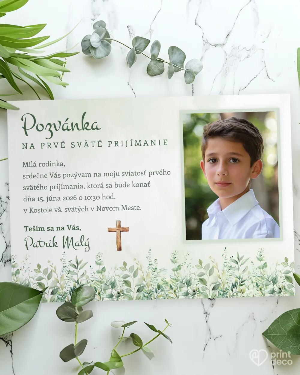 Krásné, téměř až nebeské pozvání ke svátostem křtu, prvního svatého přijímání, biřmování nebo konfirmace. Pozvání tvoří nebesky laděné pozadí, dřevěný křížek a celkovou kompozici doplňují zelené lístky a bylinky. V naší nabídce si můžete vybrat i další tiskoviny ve stejném motivu, například památeční magnetky nebo etikety na lahve – zaručujeme vám maximální spokojenost.