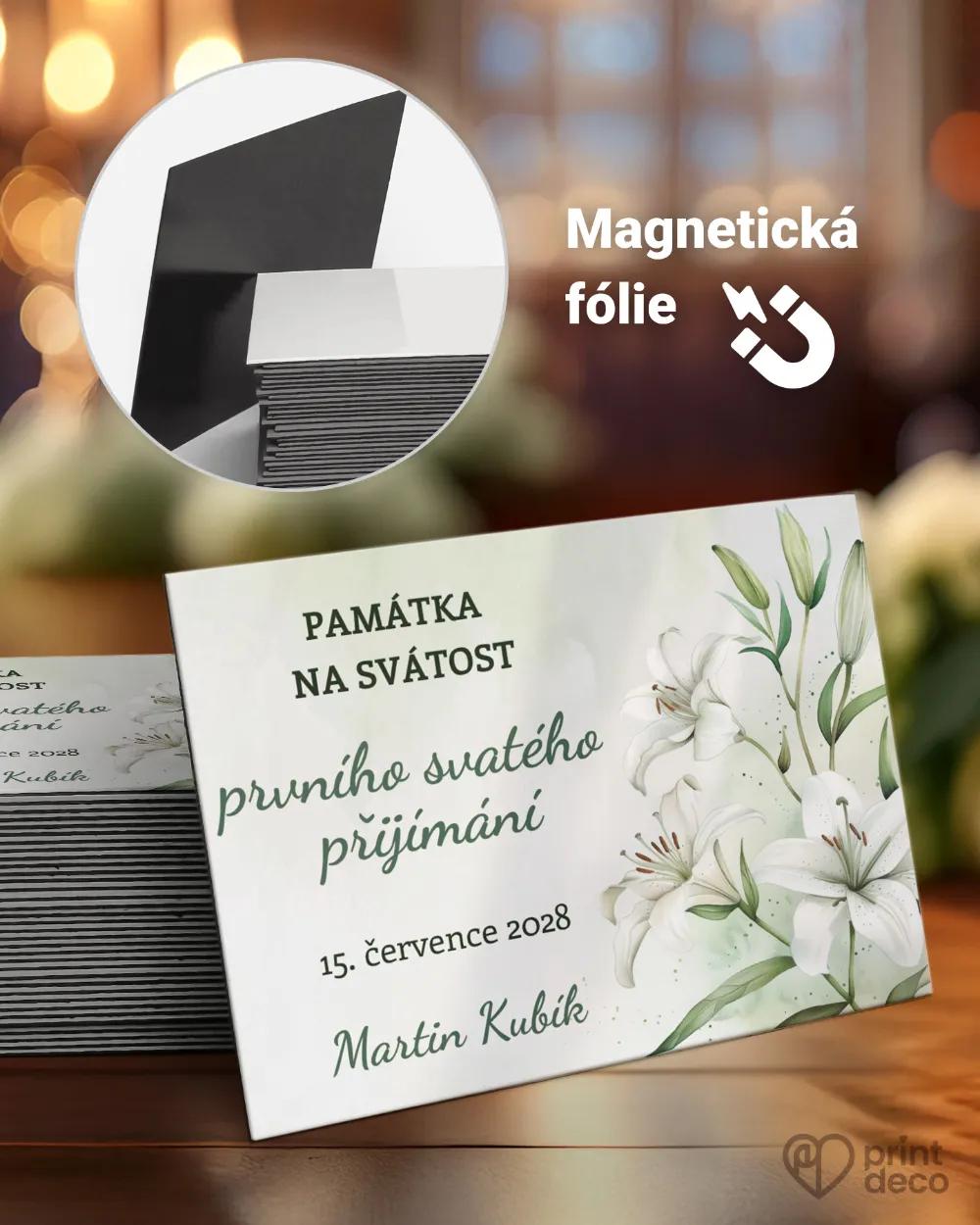 Pozvání s přírodním motivem bílých lilií, které jsou symbolem čistoty, je skvělou volbou pro svátosti jako je křest, první svaté přijímání, biřmování či konfirmace. Pozvánku doplňuje jemné nebeské pozadí, pozvání na svátost a dřevěný křížek. Využijete-li podobné prvky i při výzdobě místa hostiny a zvolíte další tiskoviny v tomto stylu, například památeční magnetky nebo etikety na lahve, garantujeme vám maximální spokojenost.