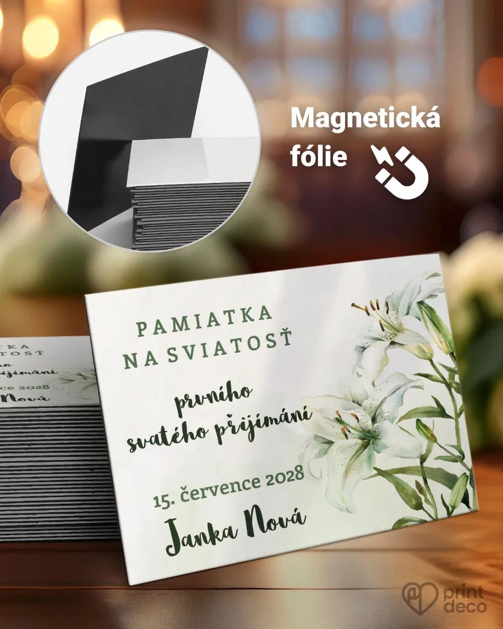 Bílé lilie jsou odjakživa symbolem čistoty. Svátosti jako křest, první svaté přijímání, biřmování či konfirmace – a především jejich účastníci – tuto hodnotu nesou v sobě, a proto je toto pozvání skvělou volbou. Využijte i možnost výroby dalších tiskovin ve stejném motivu, jako jsou památeční magnetky nebo etikety na lahve, a nebudete litovat.