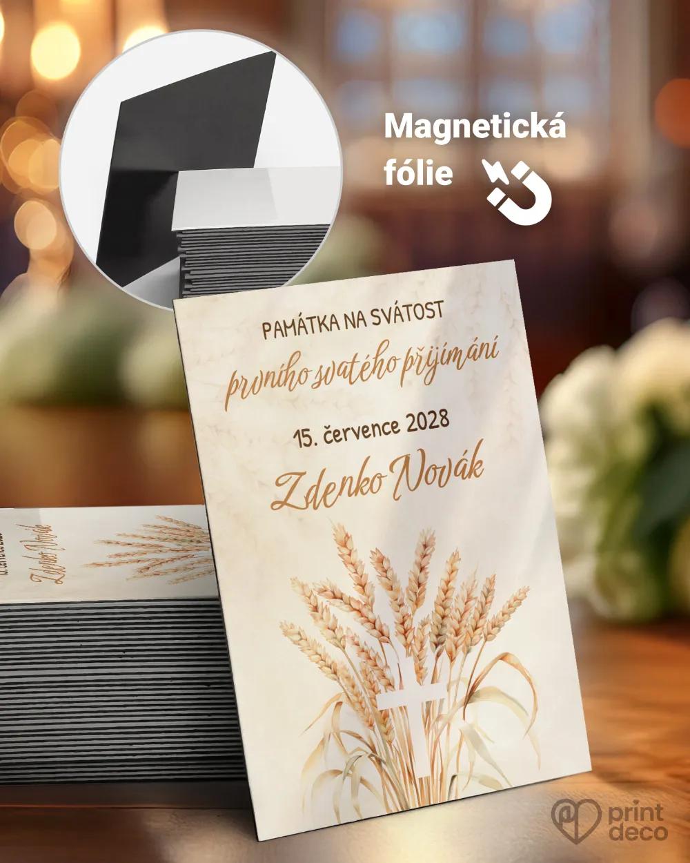 Přírodní pozvánka na svátosti jako křest, první svaté přijímání, biřmování či konfirmace. Pozvání neobsahuje žádné výrazné prvky, ale jemné zdobení pomocí klasů žita a malého bílého křížku. V tomto motivu si u nás můžete také objednat památeční magnetky nebo etikety na lahve, aby byl tento den naprosto dokonalý.