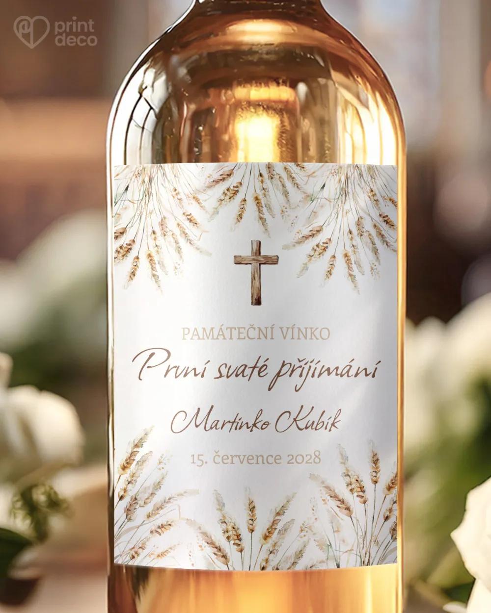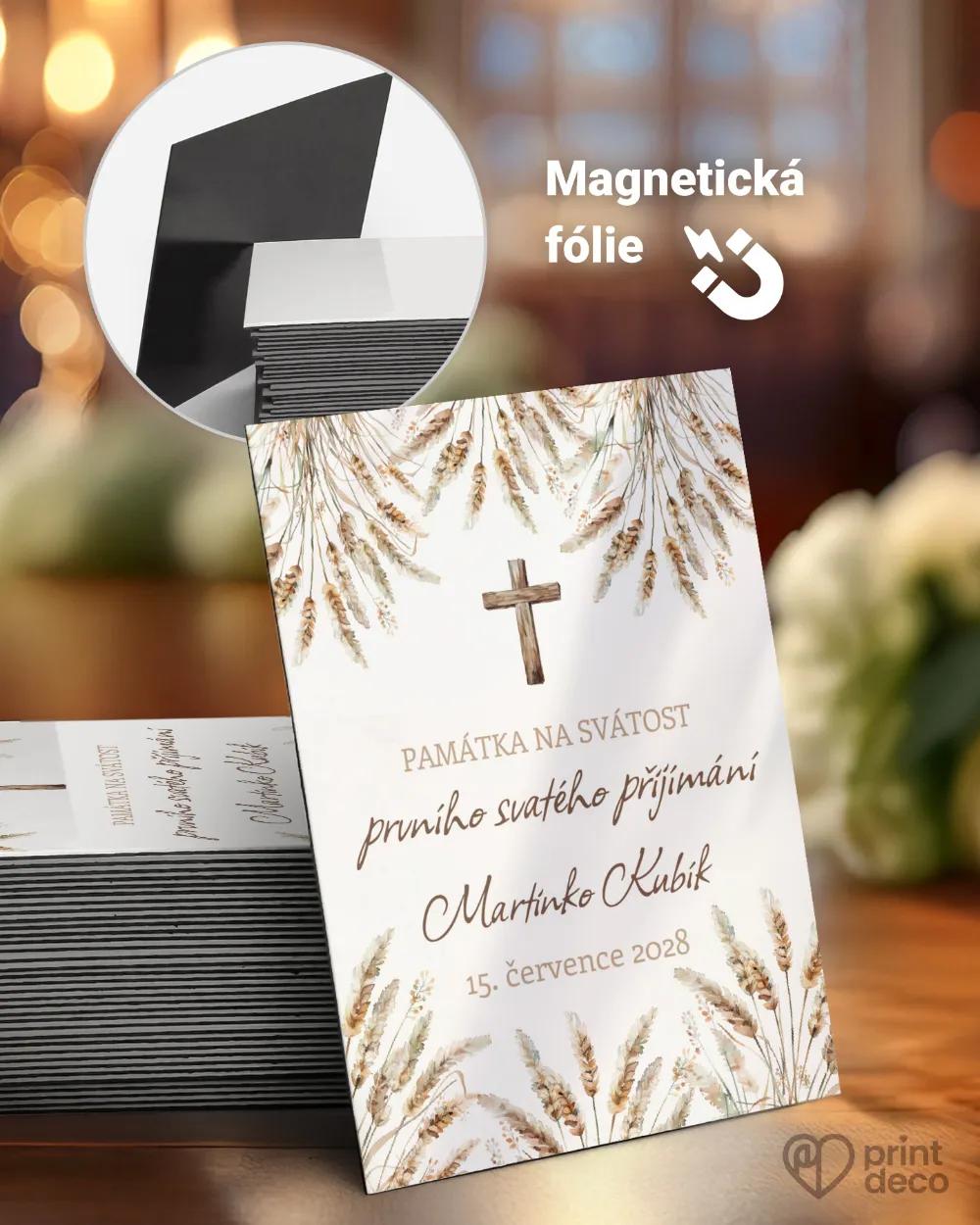 Pozvánka na svátosti jako křest, první svaté přijímání, biřmování či konfirmace, kterou tvoří jemné pozadí, pozvání na svátost a dekorace v podobě klasů žita a malého dřevěného křížku. Ve stejném duchu se může nést i následná hostina a z naší nabídky si můžete vybrat také památeční magnetky nebo etikety na lahve ve stejném motivu.