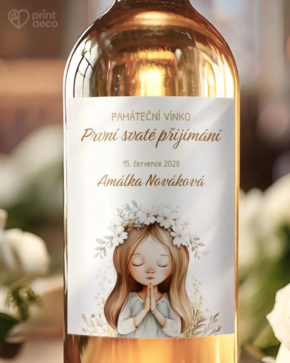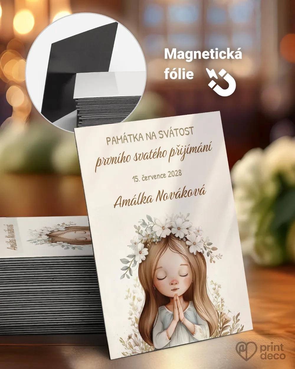 Jemné, kreslené pozvání pro všechny druhy svátostí, jako je křest, první svaté přijímání, biřmování či konfirmace. Jemné pozadí doplňuje postava kreslené holčičky s květinovým věnečkem na hlavě a v pozadí dalšími květy a lístky. V tomto motivu si u nás můžete objednat také památeční magnetky nebo etikety na lahve, aby byl tento den dokonalý.