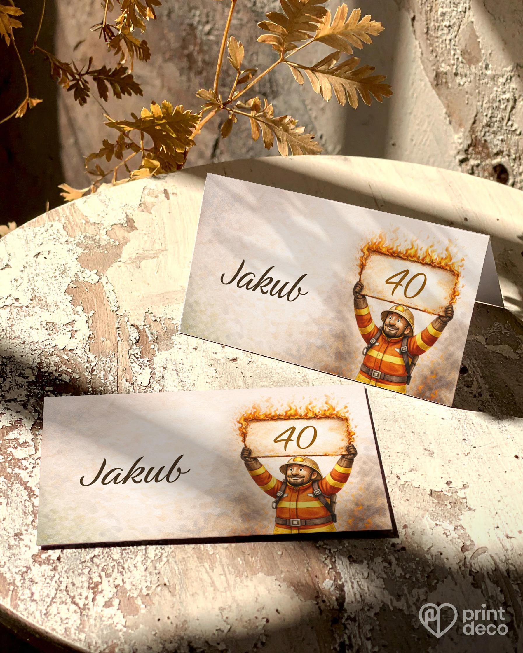 Originální narozeninová pozvánka pro hasiče s veselým hasičským motivem, ideální jako tematická pozvánka na oslavu jubilea.