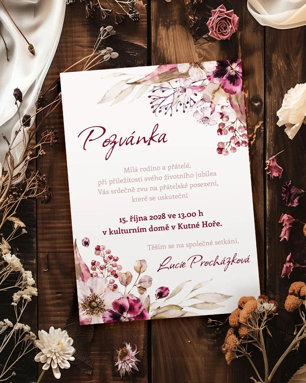 Personalizovaná pozvánka s fotkou oslavence a růžovými květy v přírodním stylu je ideální pro vkusně sladěnou oslavu.