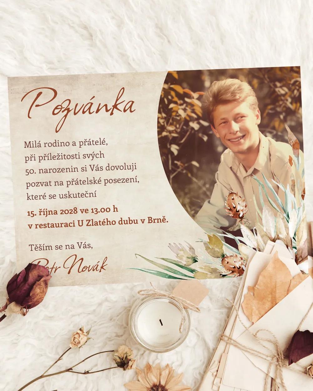 Přírodní pozvánka s bodláky a neutrálními barvami je netradiční a stylová volba pro narozeniny s přirozeným motivem.